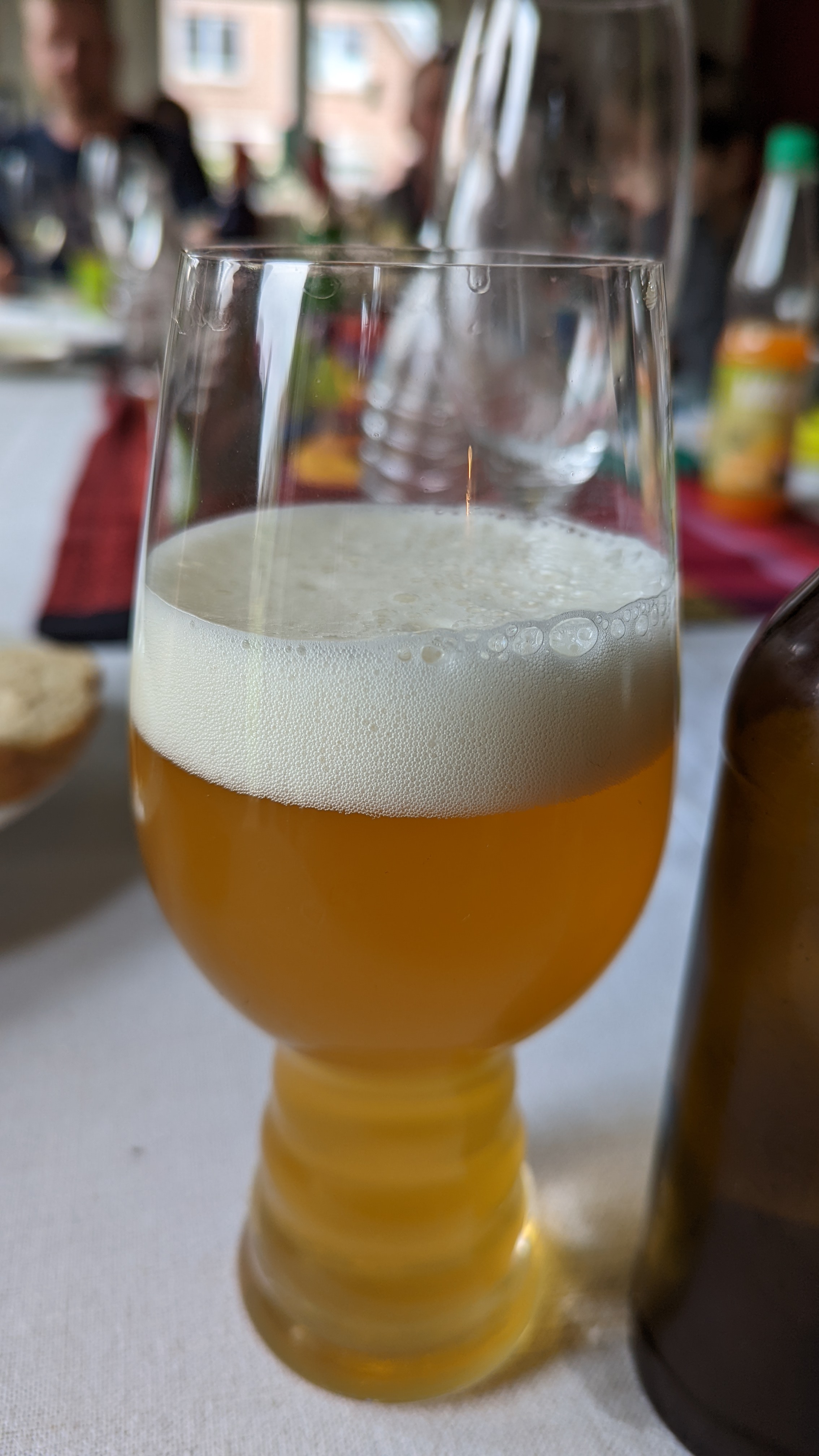 Ich trinke gerade ein Brewdog Kiez Keule dry hopped Export Lager. Mit 5,8% recht stark eingebraut. Zitrus im Antrunk, Abgang trocken, angenehme Bittere bleibt länger am Gaumen. Goldgelbe Farbe, ein klein wenig Trübung, Karbonisierung aus meiner Sicht gut gewählt für ein Export. Schaum stark, schneeweiß, feinporig, Haltbarkeit mittel. Hopfenstopfen würde ich ein Export jedoch nicht.