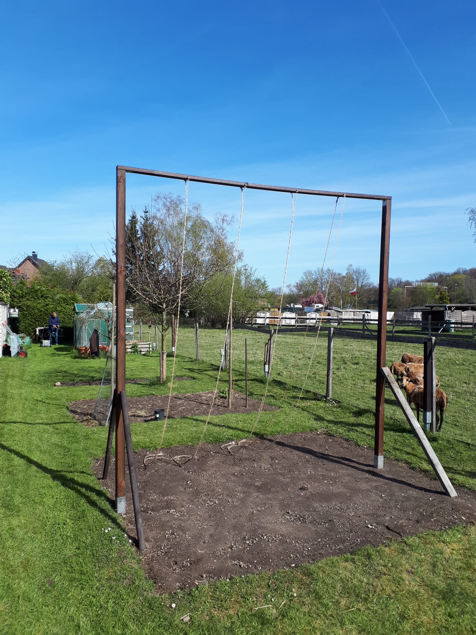 habe am WE zu Hammer und Spaten gegriffen und ein Rahmengestell zusammengezimmert mit dessen Hilfe ich gerne dieses Jahr gerne meinen eigenen Hopfen ziehen möchte. Die Stützpfosten sind noch provisorisch, aber es ist 3m breit und 3m hoch geworden. Ich wäre gerne auf 4 Meter Höhe gegangen, wollte jedoch unnötige Diskussionen mit unseren etwas seltsamen Nachbarn vermeiden.