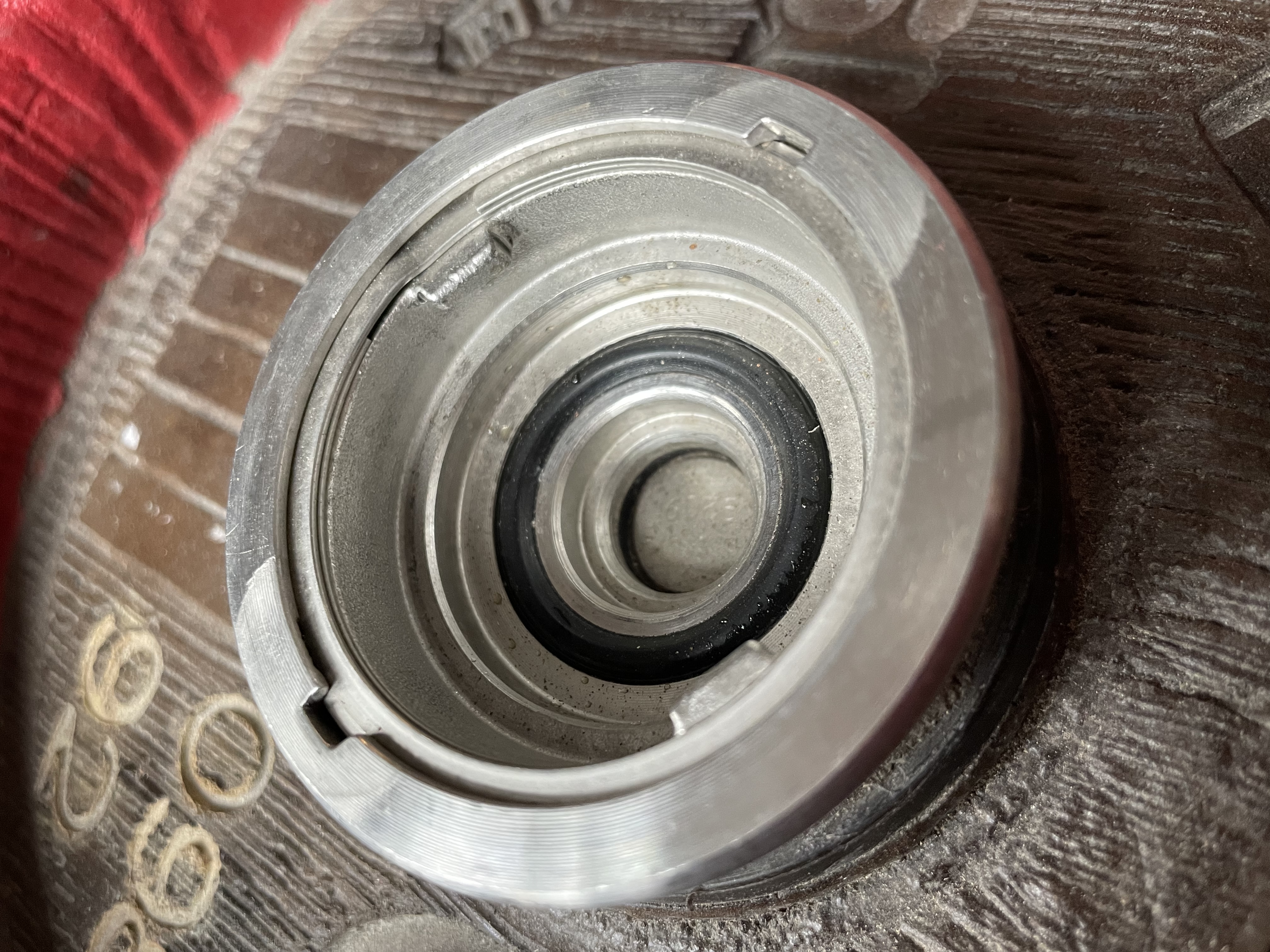 Sieht nach einem Sprengring aus. Da wird der Fitting nicht eingeschraubt, sondern durch den oben liegenden Sprengring fixiert. Den bekommt man nur mit einer speziellen Zange auf.