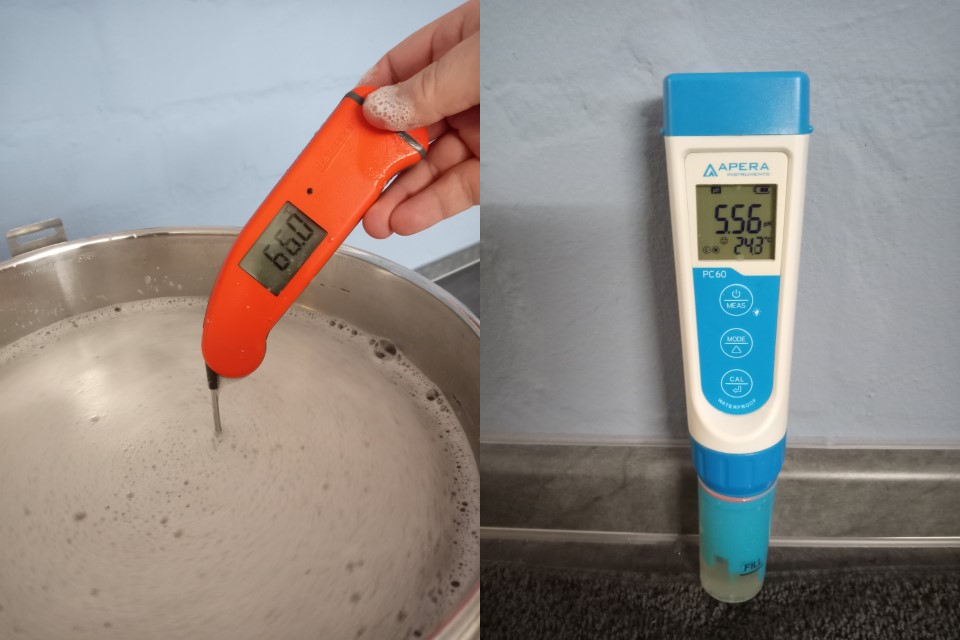 Danach wird fix eingemaischt, und kurz bevor ich den Kleinen zur Schule fahre, kontrolliere ich nochmal die Werte (25min nach einmaischen)