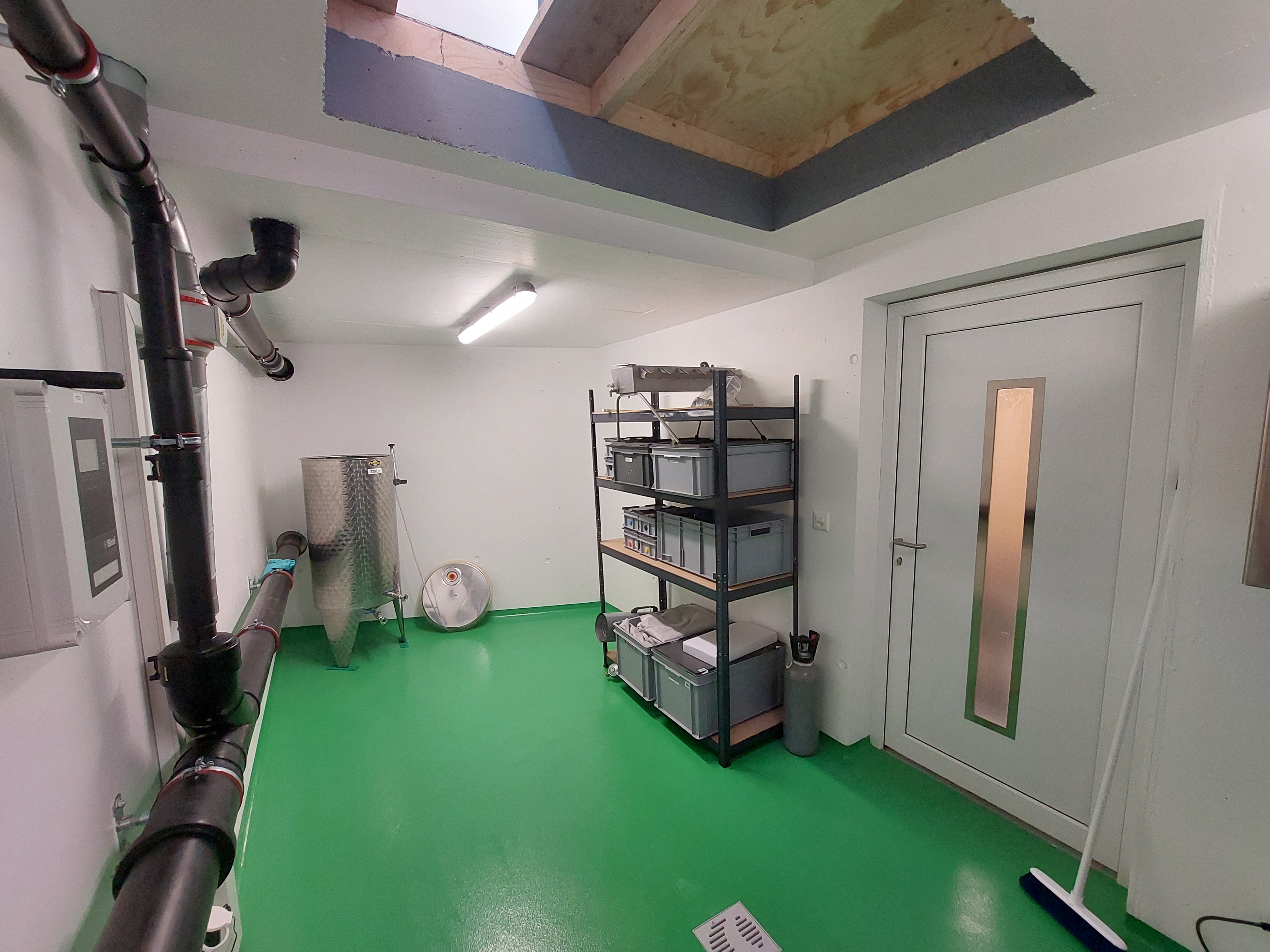 Zusätzlich haben wir auch die Lüftung für den Gär-/ Lagerkeller eingelegt. Da fehlt uns noch die Steuerung, aber die kommt auch noch vor Inbetriebnahme. Ausserdem sind mittlerweile die Fliesen für die Wände ausgesucht und der Industrieboden wird eingebracht.