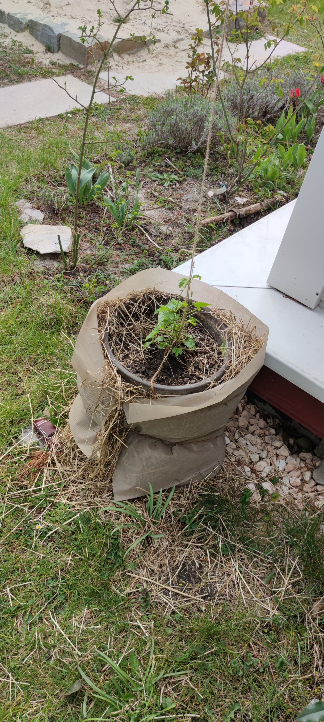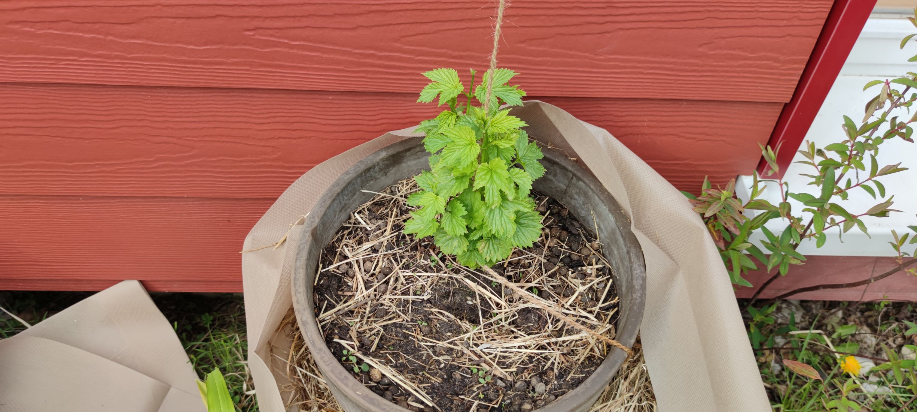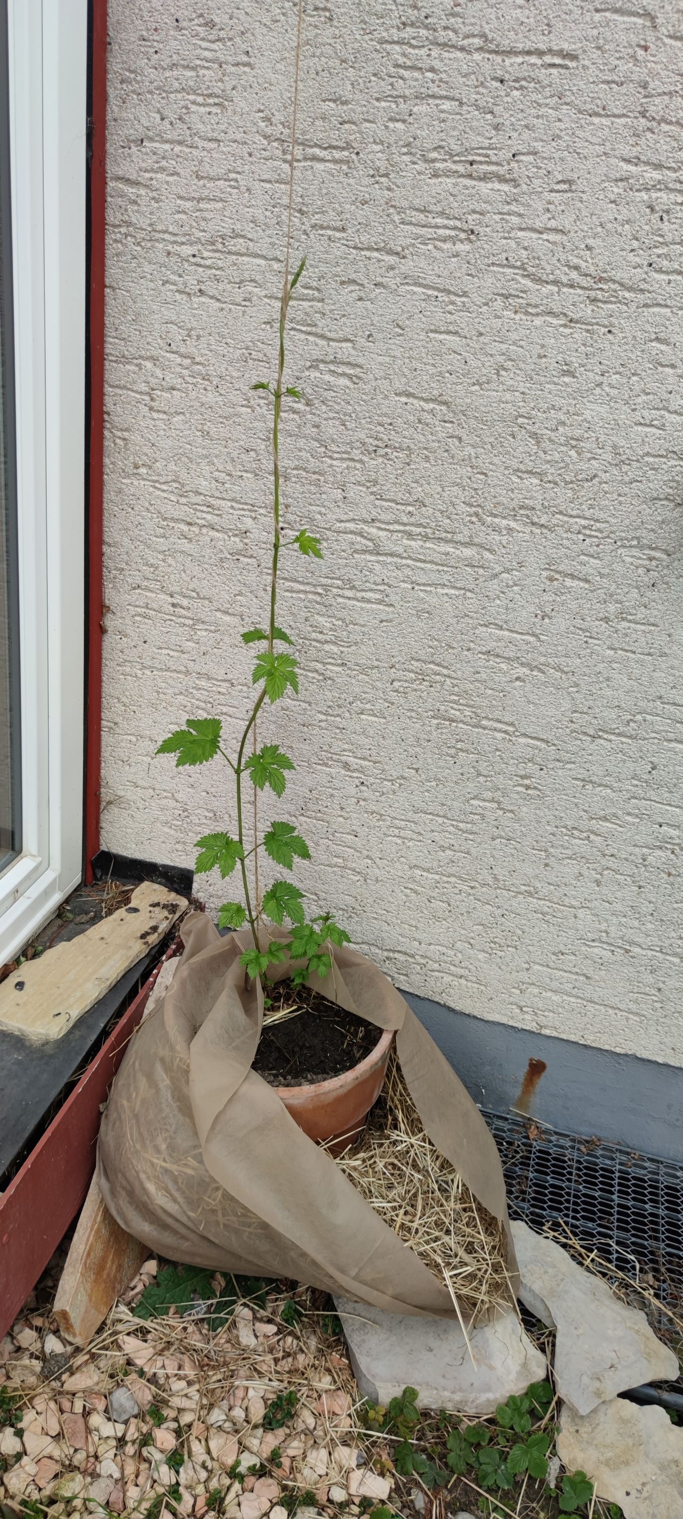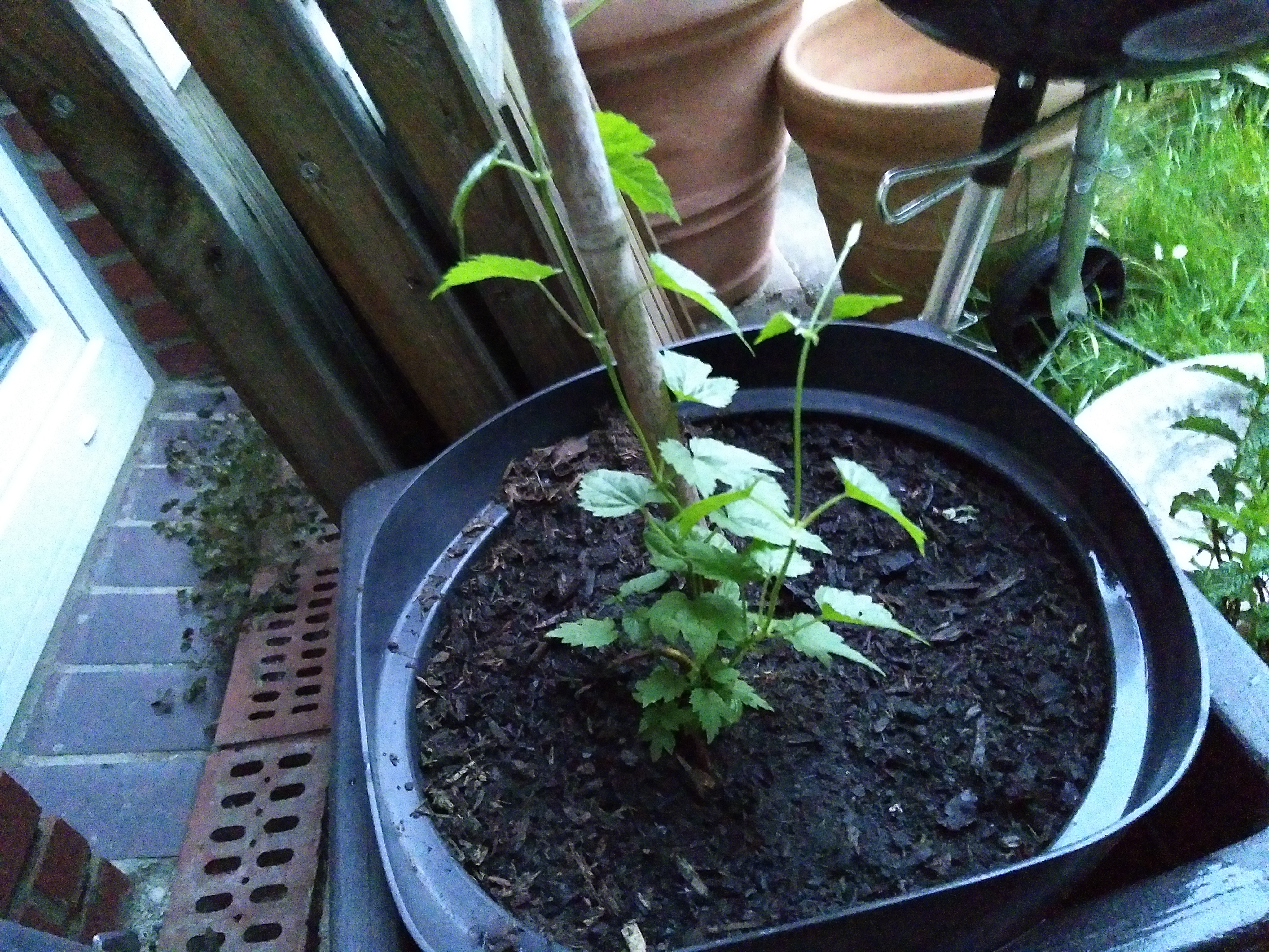 Mein Hallertauer Tango darf jetzt erstmal ein Jahr in einem größeren Topf bleiben, bevor er dann richtig eingepflanzt wird. Ansonsten wäre mir die Pflanze so spät im Jahr zu überwuchert. Er ist mit vier Trieben angekommen, ich denke ich lass es erstmal so.