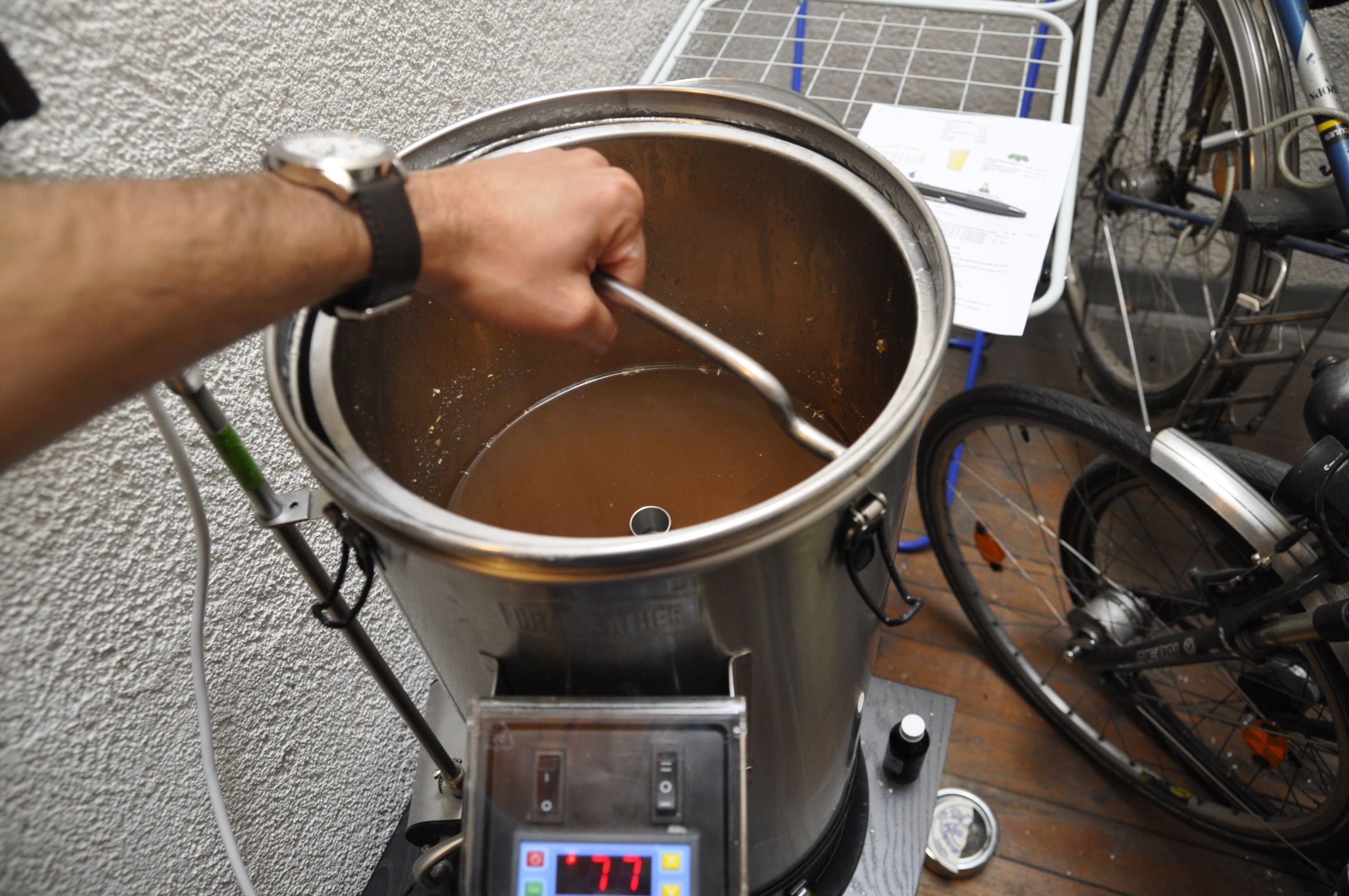 Die fehlende Automatik stört mich persönlich nicht. Beim Sud davor habe ich einen Braumeister 20 benutzt und das selbe Rezept gebraut. Mir wurde geraten, bei jeder Rast das Malz ein paar Mal durch zu rühren um die Ausbeute zu erhöhen. Wenn ich bei einem automatisch gesteuertem Braugerät einmal pro Rast tätig werde, kann ich auch gleich auf die Automatik verzichten und beim Umrühren noch die Rast eingeben.