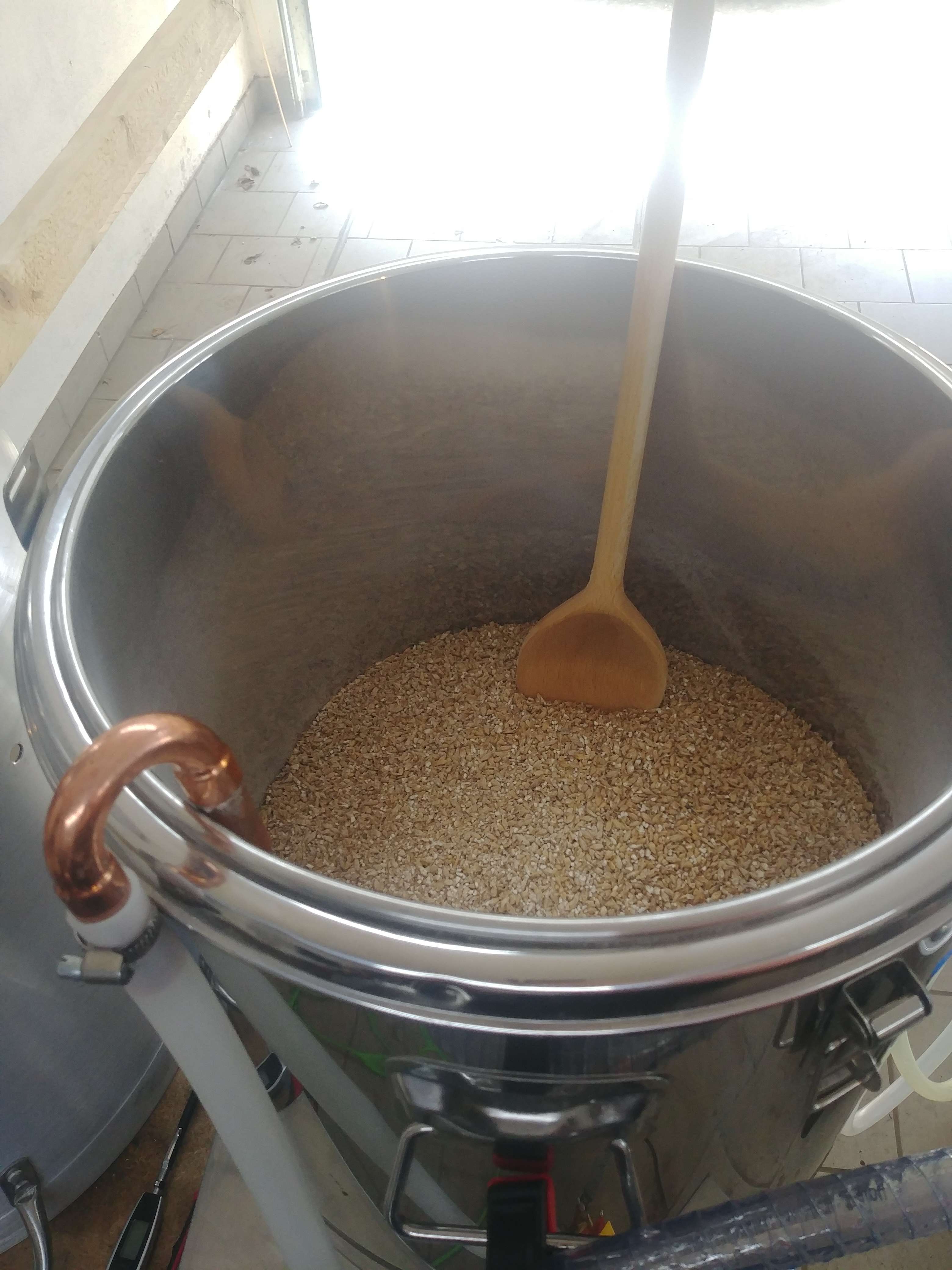 15 Liter mit 11,8° Plato sind grad im Gärbehälter gelandet. Geplant waren 16 Liter mit 11,9° Plato.