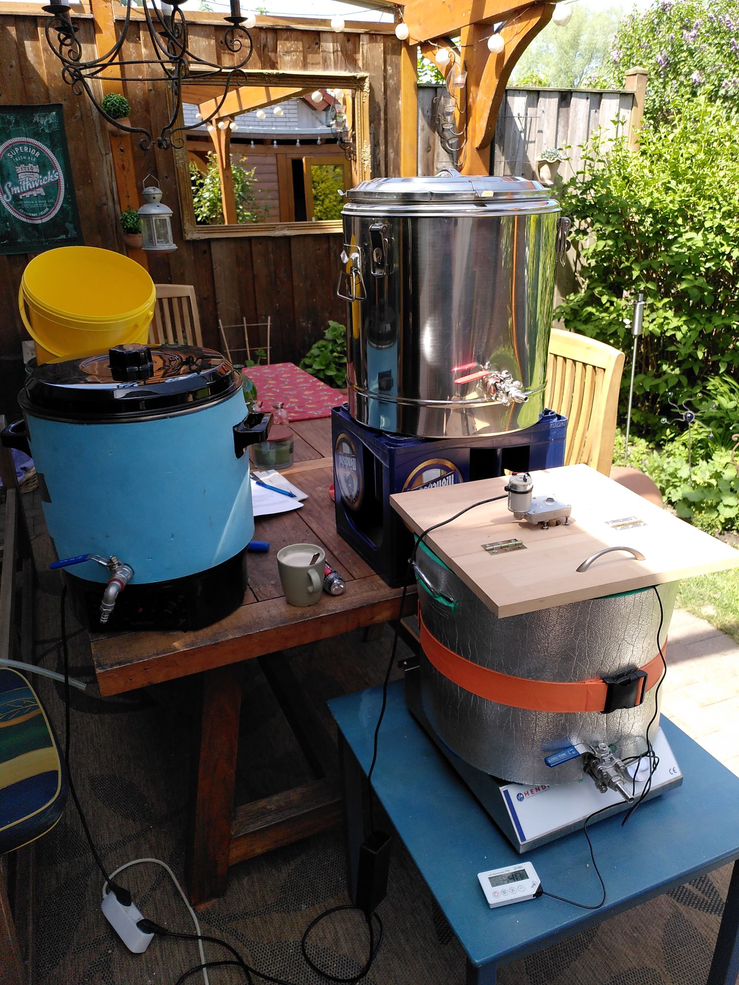 2 Töpfe (50 und 70l) 1x GSM IDS2 fürs maischen ( hoffentlich bald mit Brautomat32) und eine MetroPlatte mit großem Heizfeld für den 70l Topf