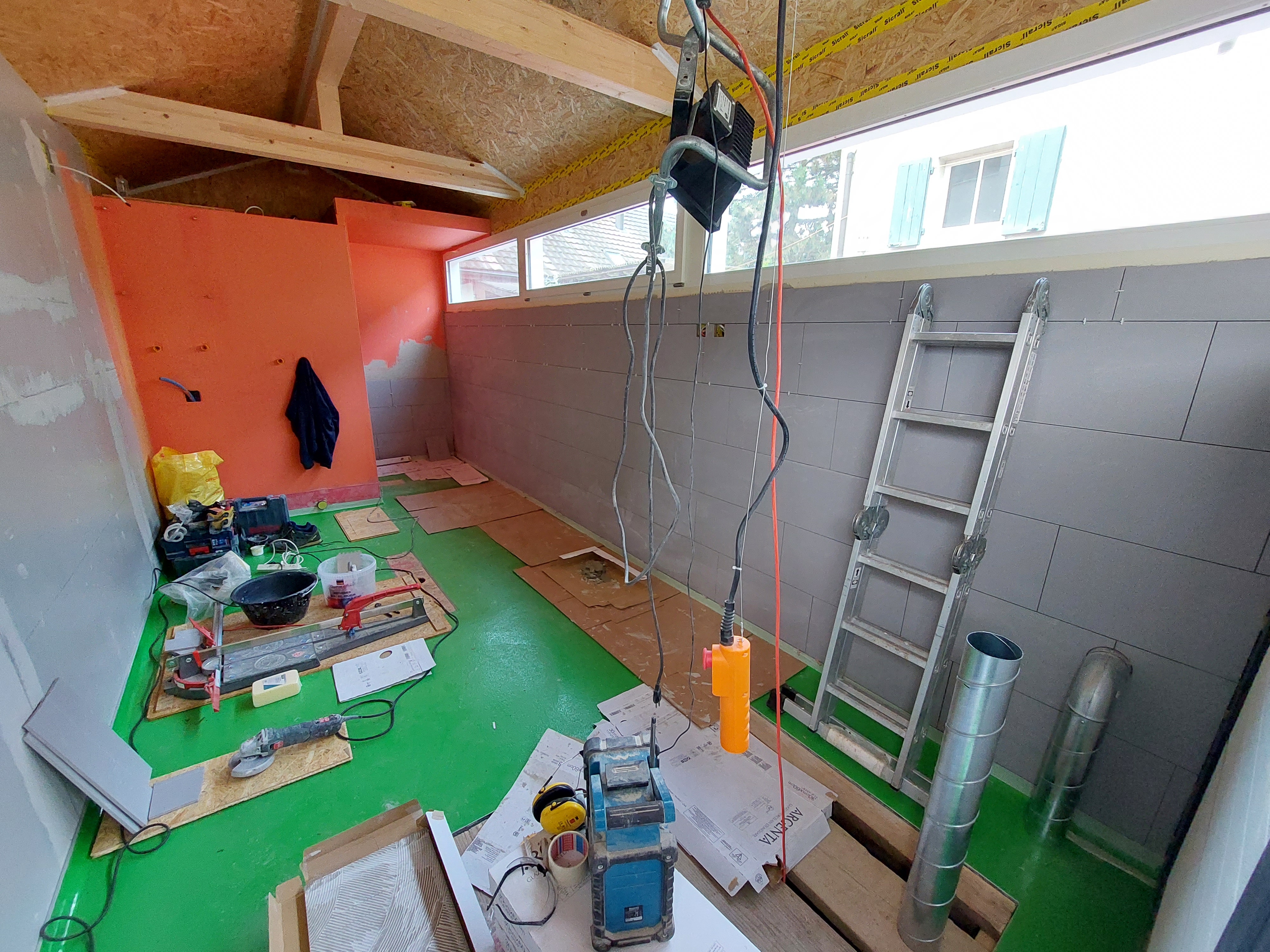 Blick in den späteren Waschbereich. Bereits mit H2O Platten verkleidet
