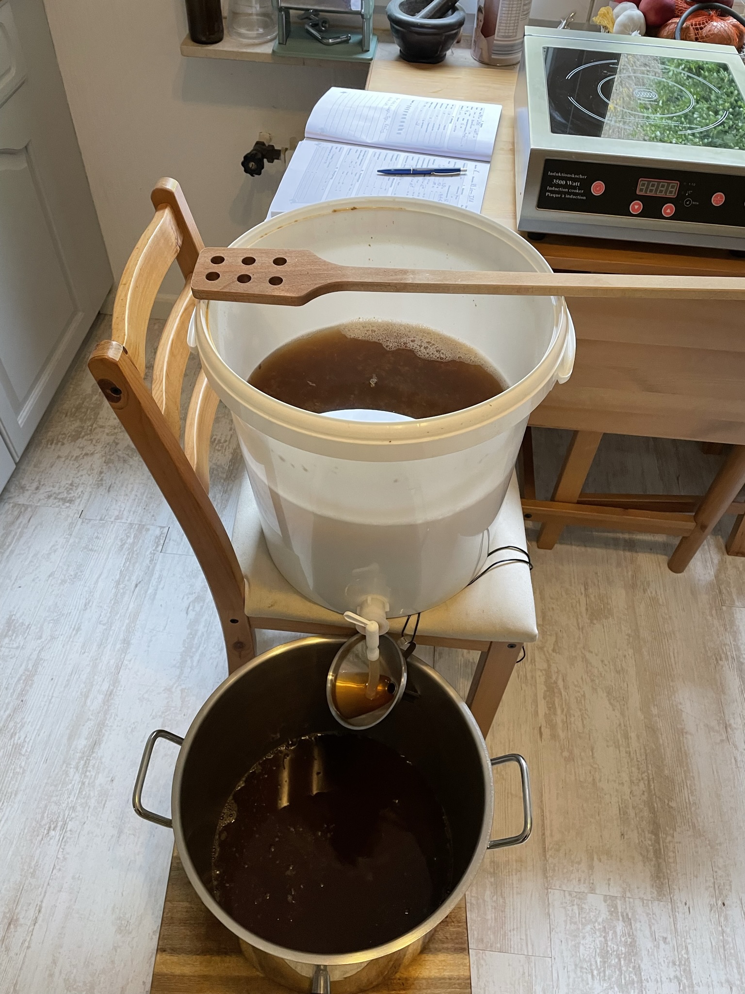 Kombirast bei 67°: Läutern, mein erstes Weizen als Läuterhalbe und es wird fleißig Buch geführt: Ich mach das Läutern immer über einen Trichter an die Kochtopfwand um ein plätschern zu vermeiden. Macht das überhaupt Sinn? Ist Sauerstoffeintrag vorm Kochen schlimm? Hauptguss: 13,2 l