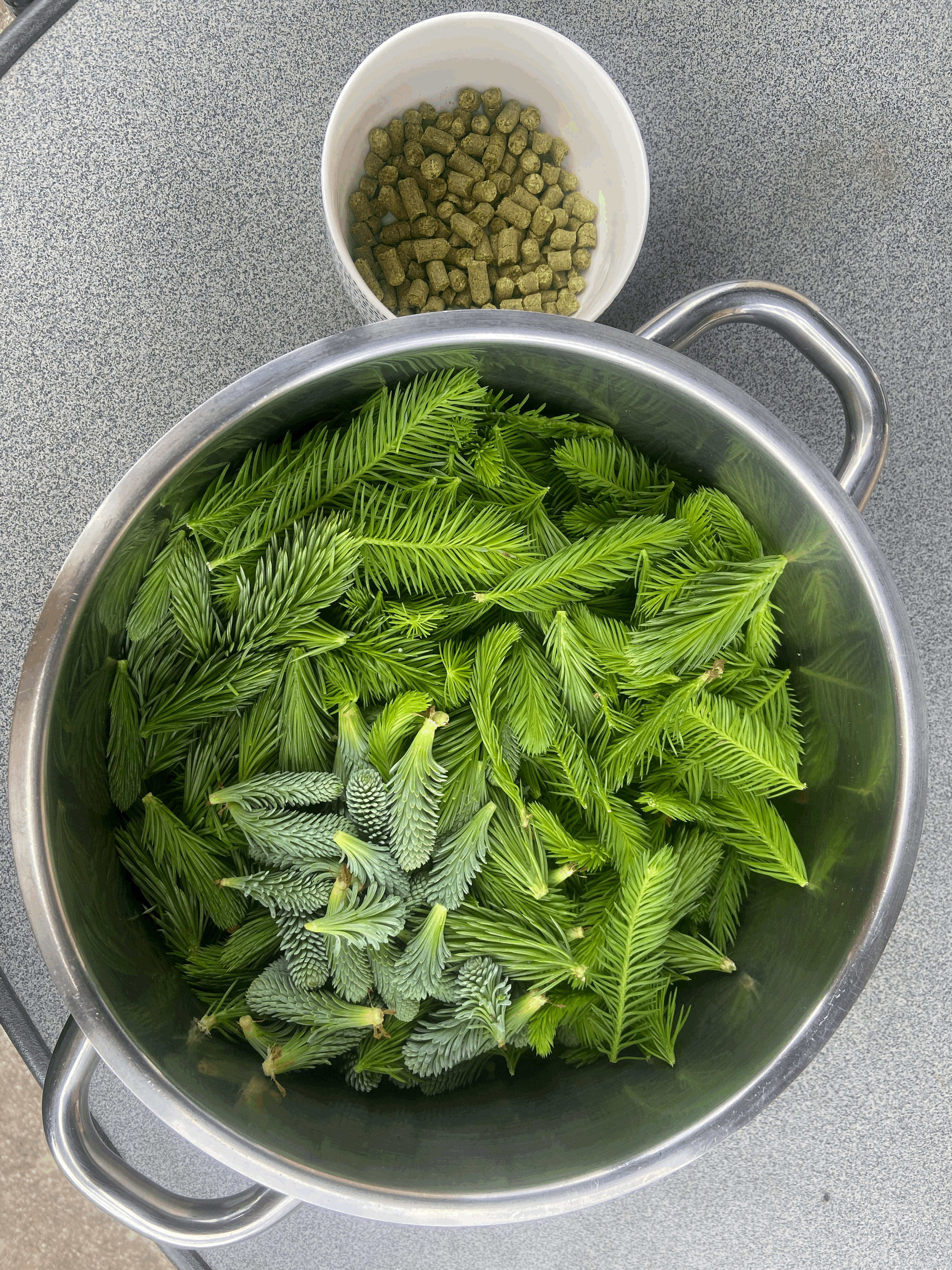 Ich habe etwa 2l Fichten- und Tannentriebe verschiedener Arten gesammelt, überwiegend im eigenen Garten. Die Tannentriebe schmeckten und rochen übrigens besonders gut, sehr zitronig und frisch. Eine gute Handvoll Hallertauer Tradition, die noch von einem früheren Sud übrig waren, habe ich in die Maische geworfen.