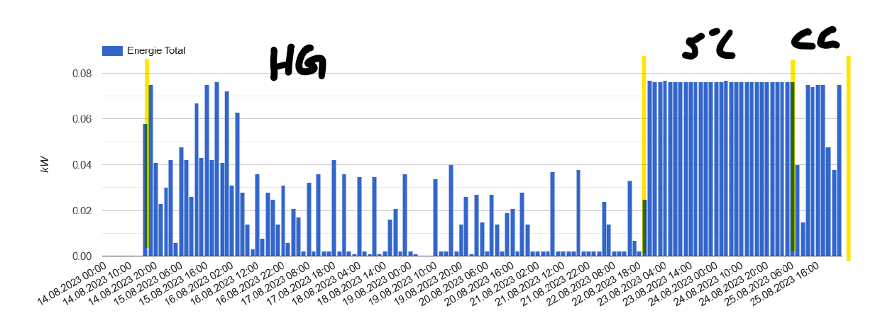 Ich hatte endlich mal Zeit die Leistungsaufnahme des Ferminator's aufzuzeichnen. Bin allgemein zufrieden damit auch wenn ich für einmal zum Schluss die angestrebten 0-2°C nicht erreichen konnte (wohl wegen den wärmeren Umgebungstemperaturen als sonst in meinem Keller)