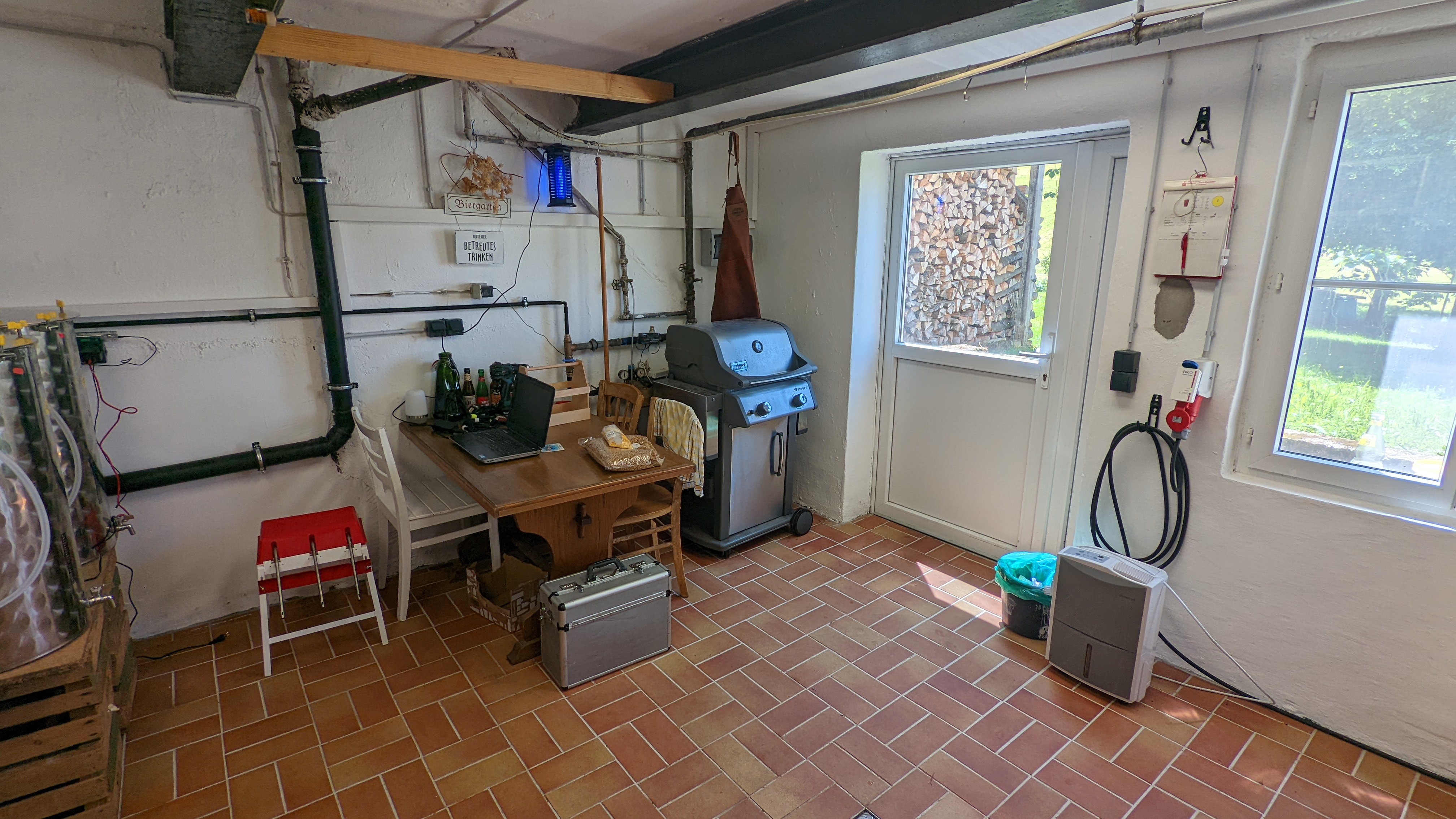 Im Sommer 2021 haben wir dann die alte Brennküche renoviert, die übrigen Küchenteile eingebaut und in unsere Braustube umgebaut. Ein Elektriker und ein Sanitärer in der Familie haben dann geholfen noch Wasser und reichlich Strom zu verlegen. In Eigenarbeit haben wir den Raum gefliest, gestrichen, die Küchenteile eingebaut und eine von meinem alten Verein übrige Edelstahlspühle, die sie nicht brauchen konnten, hinzugefügt. Aus der Verwandschaft wurden noch Tisch und Stühle beigesteuert, aus der alten Arbeitsplatte haben wir den Maisch- und Kochbereich konstruiert.