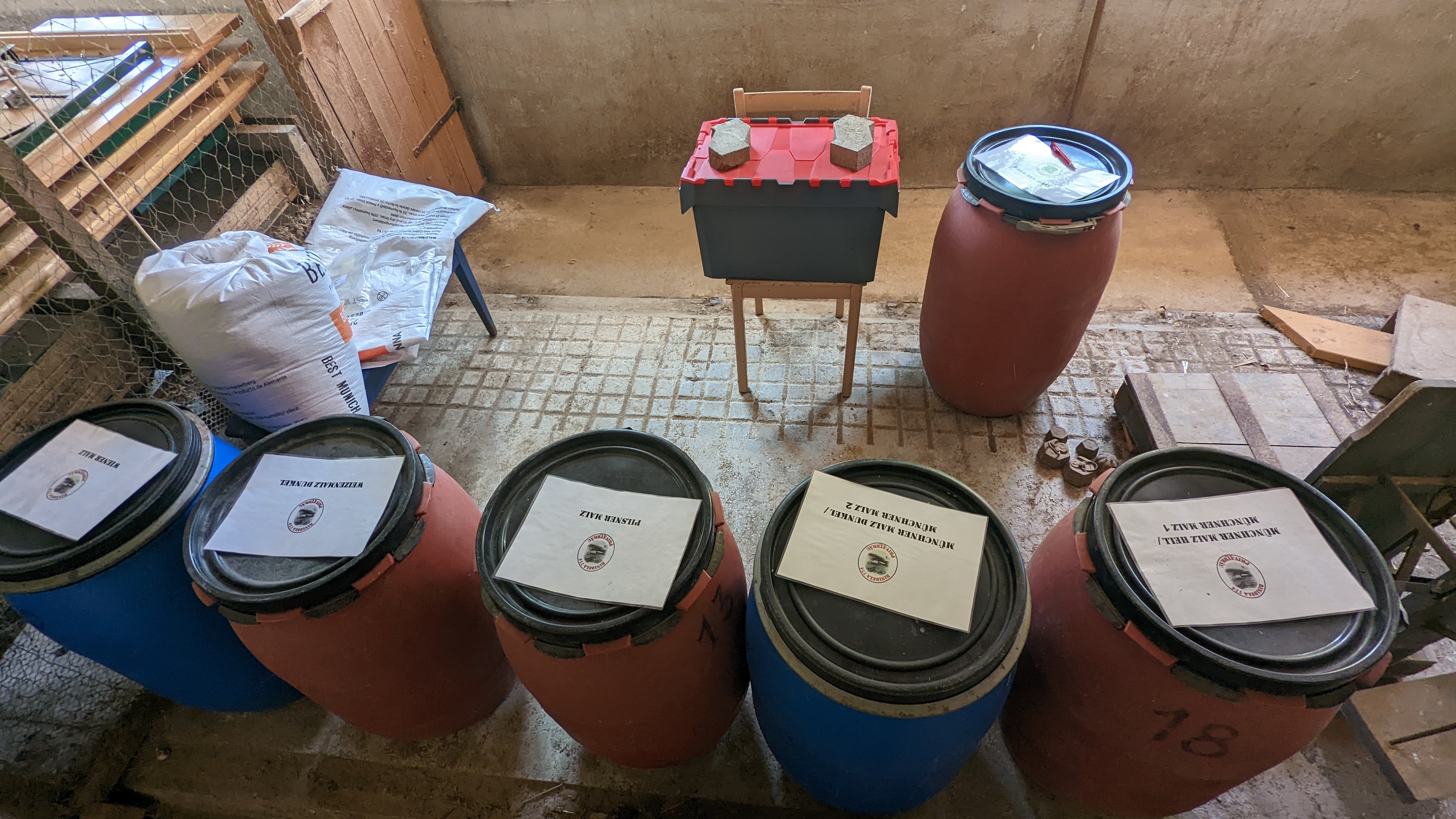 Aus Platzgründen in einem ehemaligen Stall. Auch hier hat mein Vater noch was beigesteuert. Aus seiner aktiven Landwirtszeit hatte er noch alte Einwegindustriefäßer übrig, die er nicht mehr nutzt. Hier lagern unsere Basismalze, in der Kiste was an Spezialmalzen grad noch rumliegt.