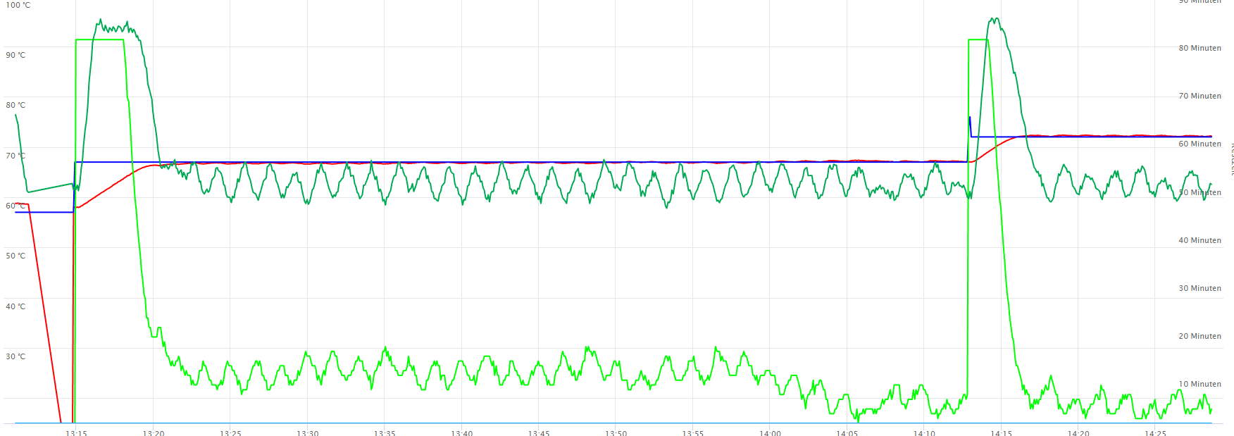 Bei der Kaskade war der D-Anteil sehr gut und wichtig, da der von 100% auf 95 % reduzierte Stellgrad nur in einem Sollwert von 95 °C für den Folgeregler ergeben hat, dieser die aber nie erreicht hat, wurde mit 100% geheizt. Das übereizen ohne den D mit 0,5K konnte mit dem D auf 0,1K Reduziert werden und das mit der theoretischen Dauer von 1100s. Ok waren auch 11kW auf 50 kg Hauptguss und 16 kg Wasser im Doppelmantel.