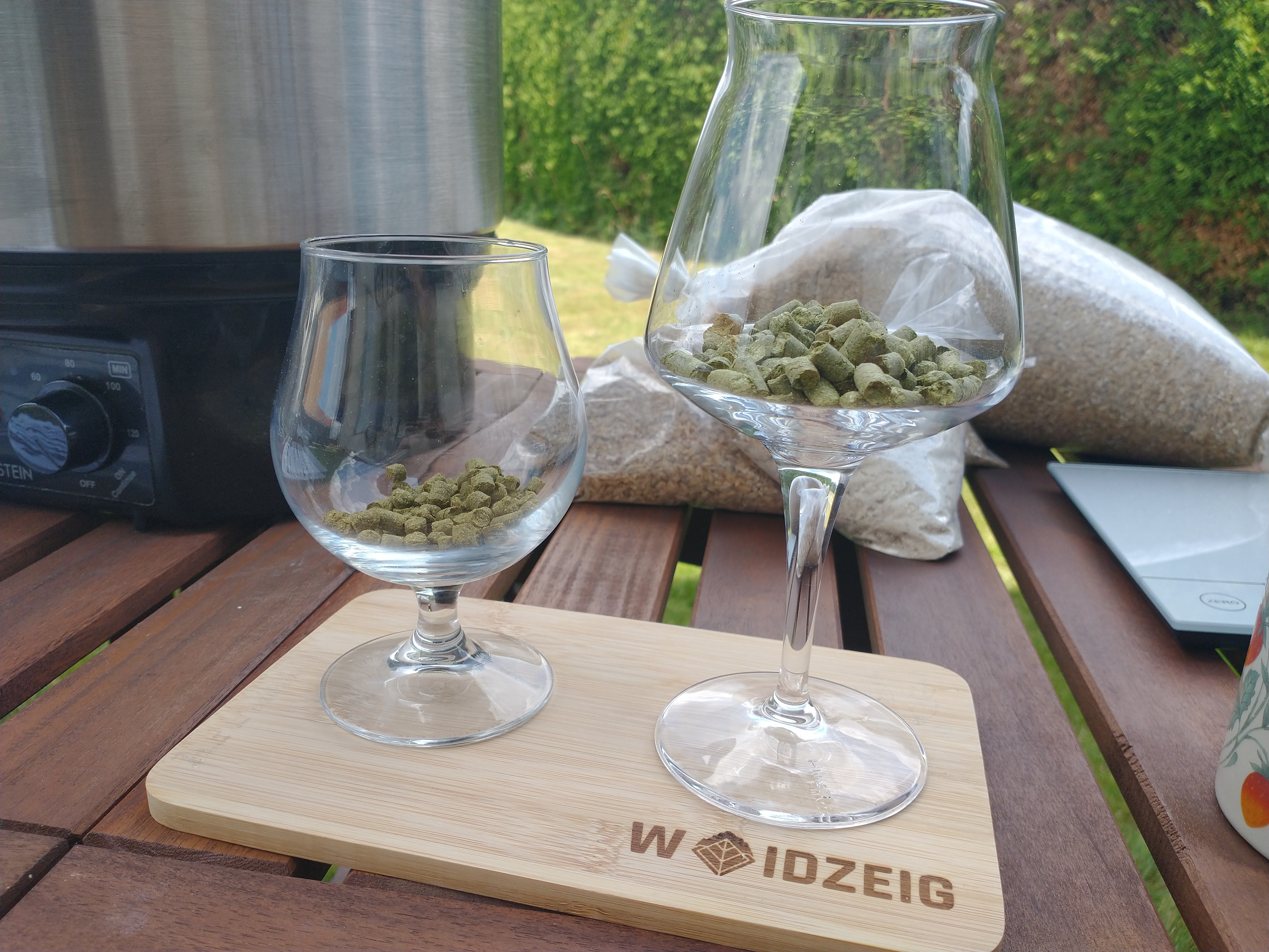 Allerdings habe ich die Schüttung meinem heimischen Wasser angepasst, also 100% MüMa 2. Gehopft wird ausschließlich mit Hersbrucker, auch zur Bitterung. Ein Heißauszug dieses Hopfens erbrachte einen Grünen Tee mit Bergamotte oder Limette. Bin mal gespannt, ob davon was im Bier landet....