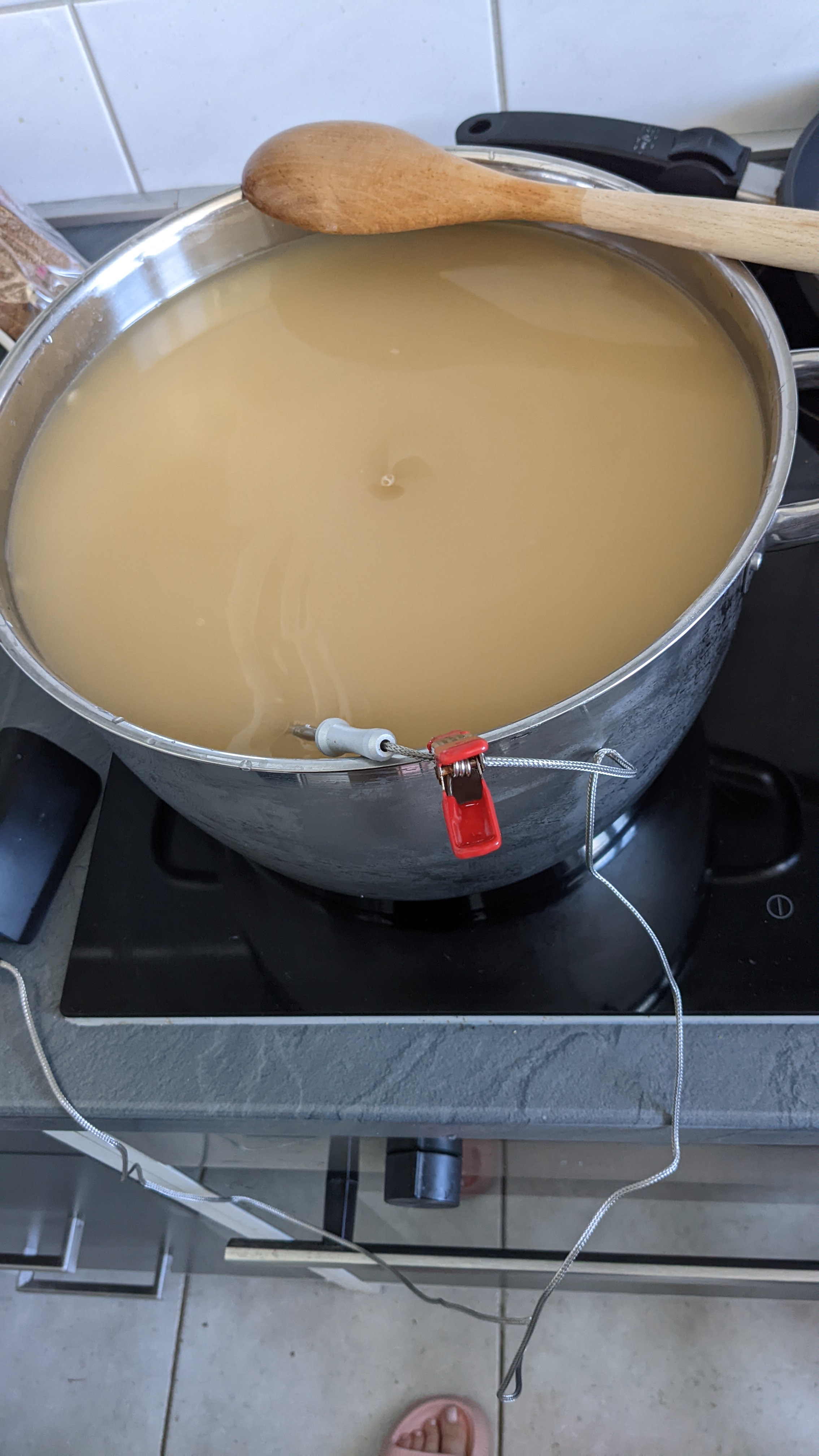 Anschließend wurde abgeläutert. Das ging aufgrund des Kaltmaischens und der damit einhergehenden niedrig-viskosen Würze sehr fix. Egal wie viel Würze man vorlaufen lässt, sie bleibt trübe. Das scheint aber normal zu sein (Websites berichten gleiches), und hat keinerlei Bedeutung für die Klarheit des finalen Biers. Die sehr kalte Würze aufzuheizen dauert natürlich entsprechend. Jetzt geschieht während des Aufheizens das, was normalerweise beim Maischen passiert. Die wenig enthaltene Stärke wird zu vergärbarem Zucker umgewandelt. Wir (ich hatte tatkräftige Unterstützung von meiner Freundin) haben langsam hochgeheizt und bei 64 °C eine Weile gehalten. In Zukunft würde ich einfach durchheizen auf 72 °C und schauen, wann die Würze Iodnormal wird und dann direkt auf 100 °C hochheizen. Das sollte reichen, alle Stärke umzuwandeln und reduziert evtl nochmal die finale Menge vergärbarer Zucker, wennn man die Maltose-Rast mehr oder weniger überspringt. Das hängt natürlich auch von der Leistung der Heizquelle ab. Während des Hochheizens flocken extrem viele Eiweiße aus. Auch diese Beobachtung deckt sich mit denen aus Internetquellen. Nach dem Hochheizen auf 100 °C wurde dann der Hopfen wie folgt dazu gegeben:
