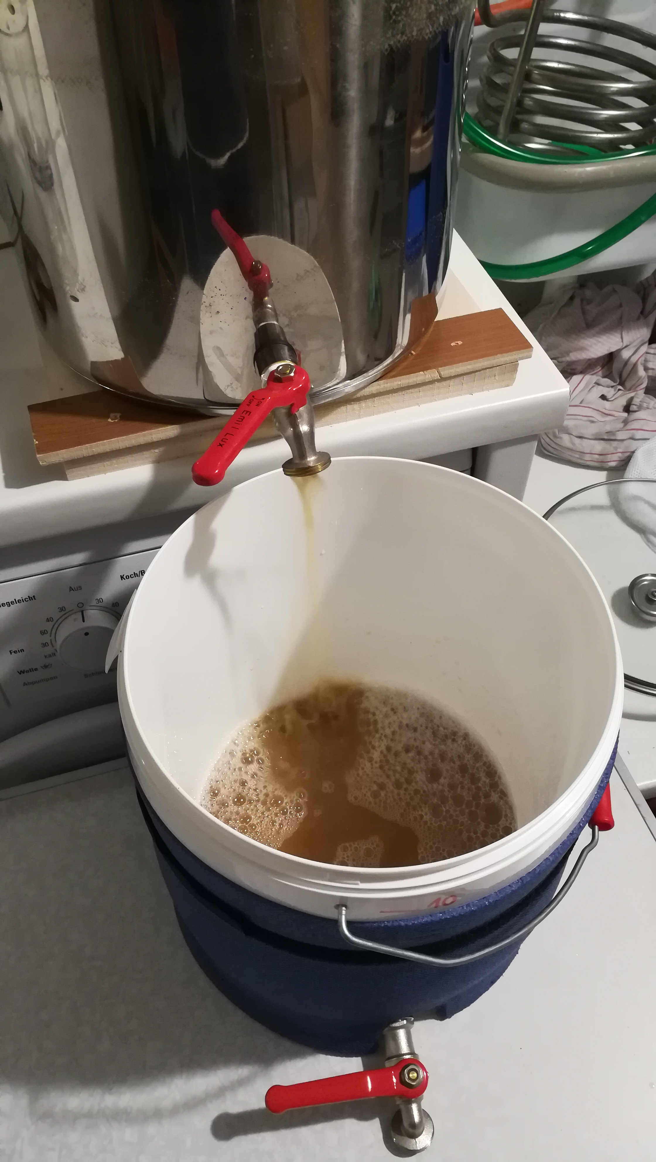 14:15: Würze ist auf Anstelltemperatur. Hefe rein.