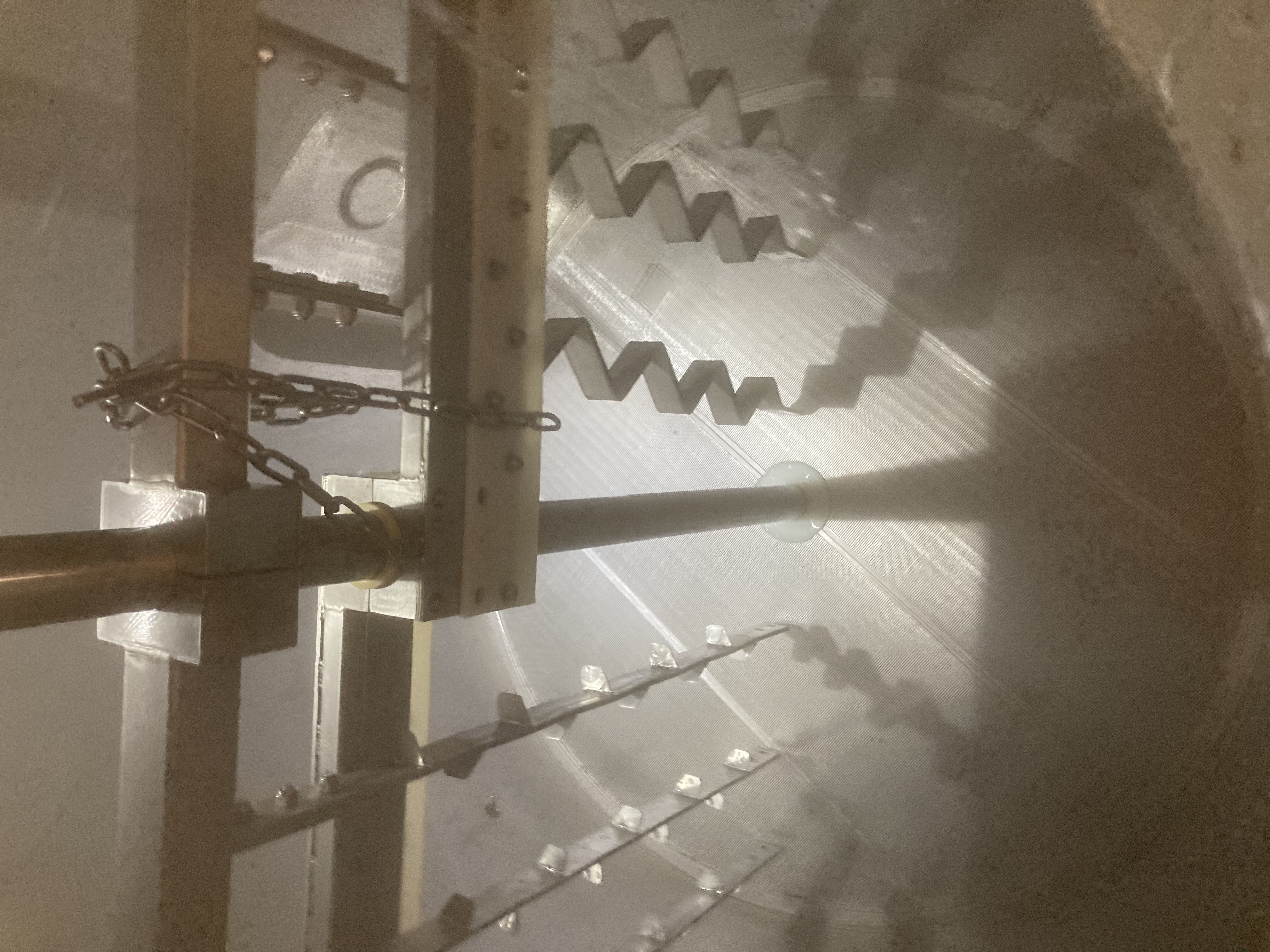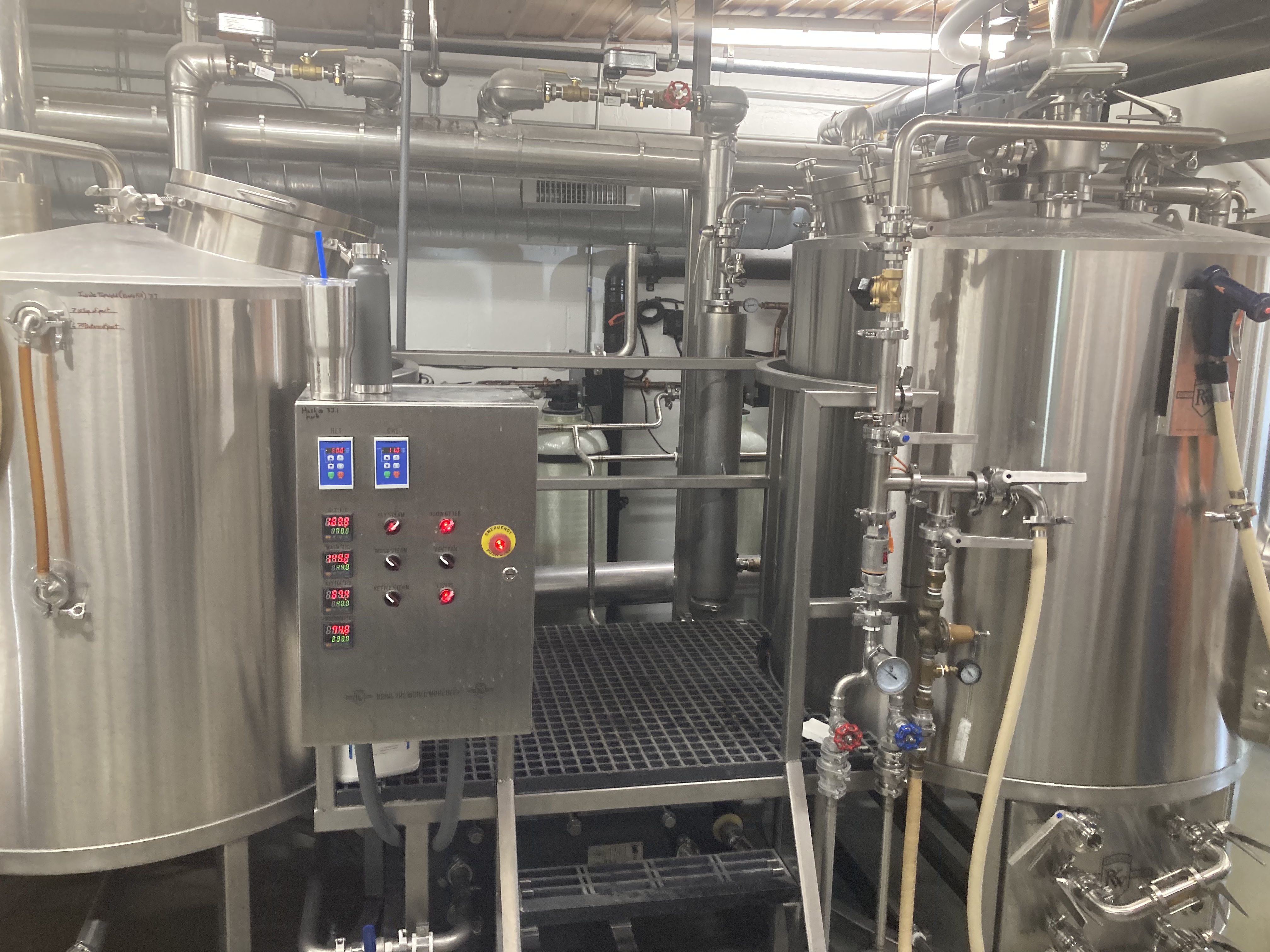 Das 8.2hl Zweigerätesudwerk ist eigentlich wie ein sehr großes Malzrohrsystem konzipiert. Die Würze wird unter dem Läuterboden abgezogen, läuft über einen Wärmetauscher, und springt oben wieder in den Läuterbottich ein. Eigentlich schrieb ich deshalb, weil das nicht funktioniert. In der Praxis wird hier nur per single Infusion Mash gebraut.