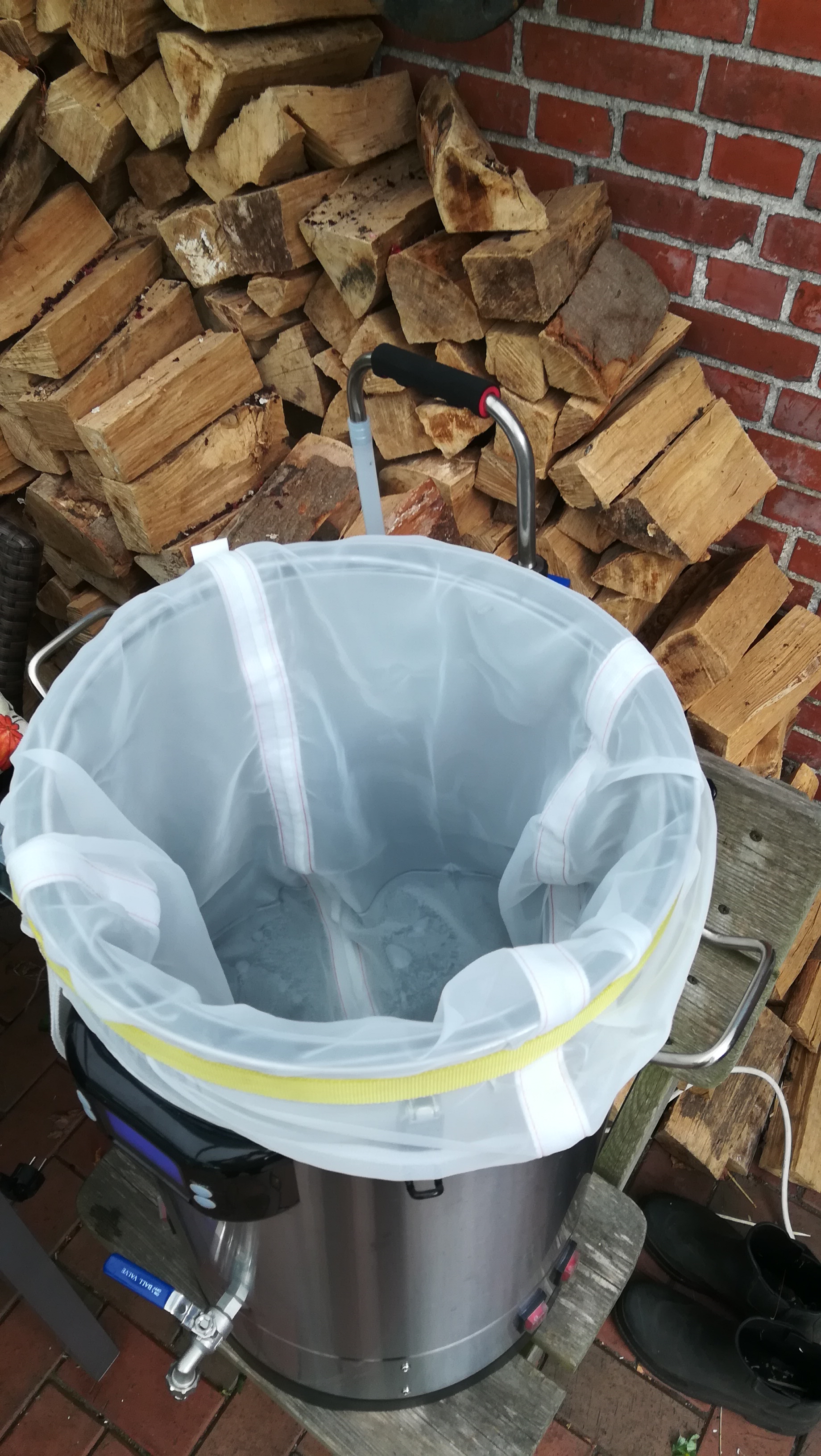 Inspiriert war ich durch Post 1487 aus den Grainfather Tipps & Tricks, beim ersten Sud mit dem S40 habe ich meinen Biab-Sack für den Einkocher verwendet. Den hatte ich vor Jahren eine Zeit lang verwendet, der passt aber nicht so toll in den Grainfather, da zu klein. Mit dem BIAB-Sack kann man feiner schroten und so die Ausbeute erhöhen. Wie geschrieben hat das aber mit dem neuen, größeren Sack nicht so funktioniert, die Maschenweite ist wohl für das Pumpen zu klein.