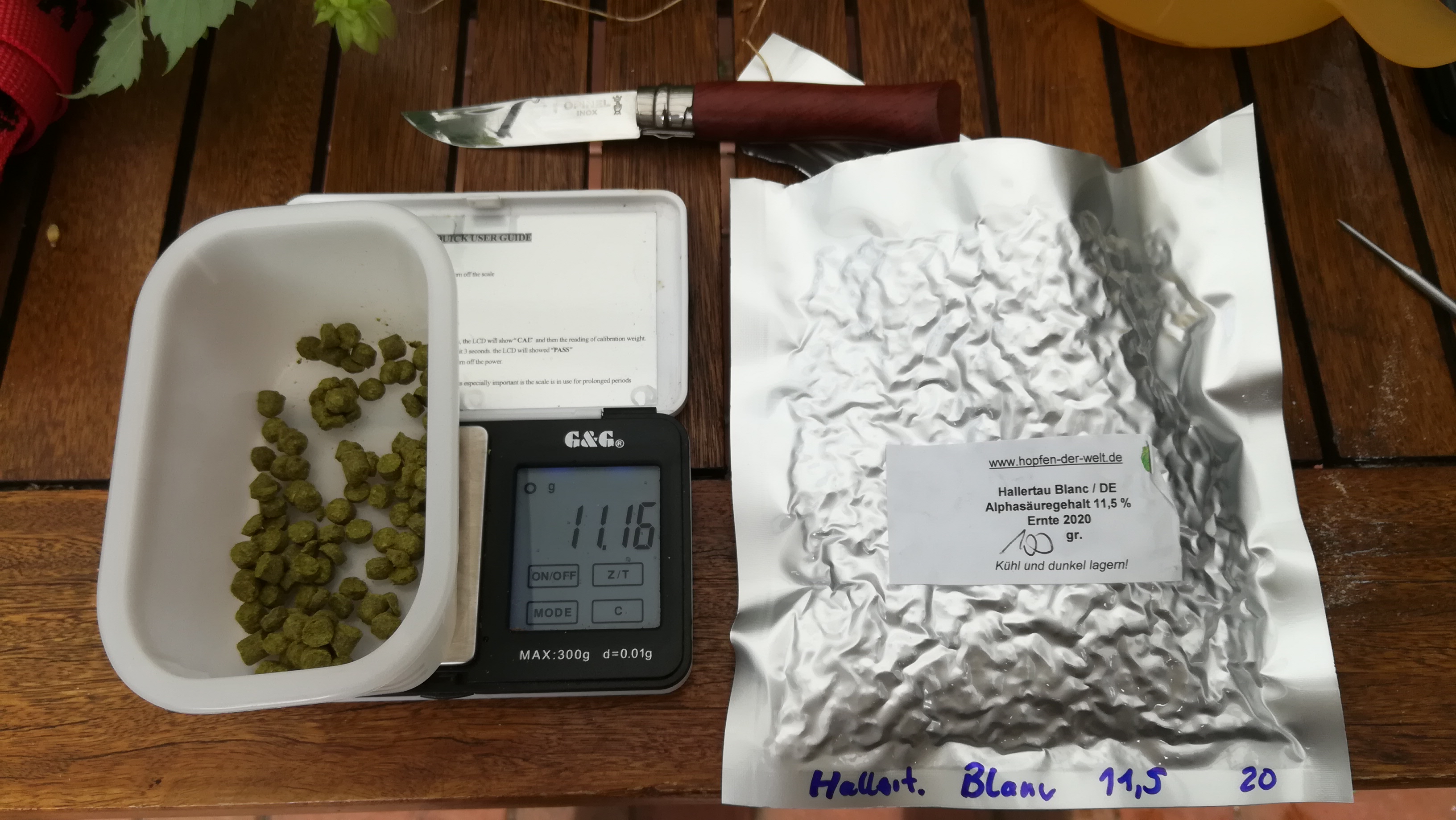 20 g Hallertau Blanc @ 11,5% 20 min bei 80 Grad WP-Gabe