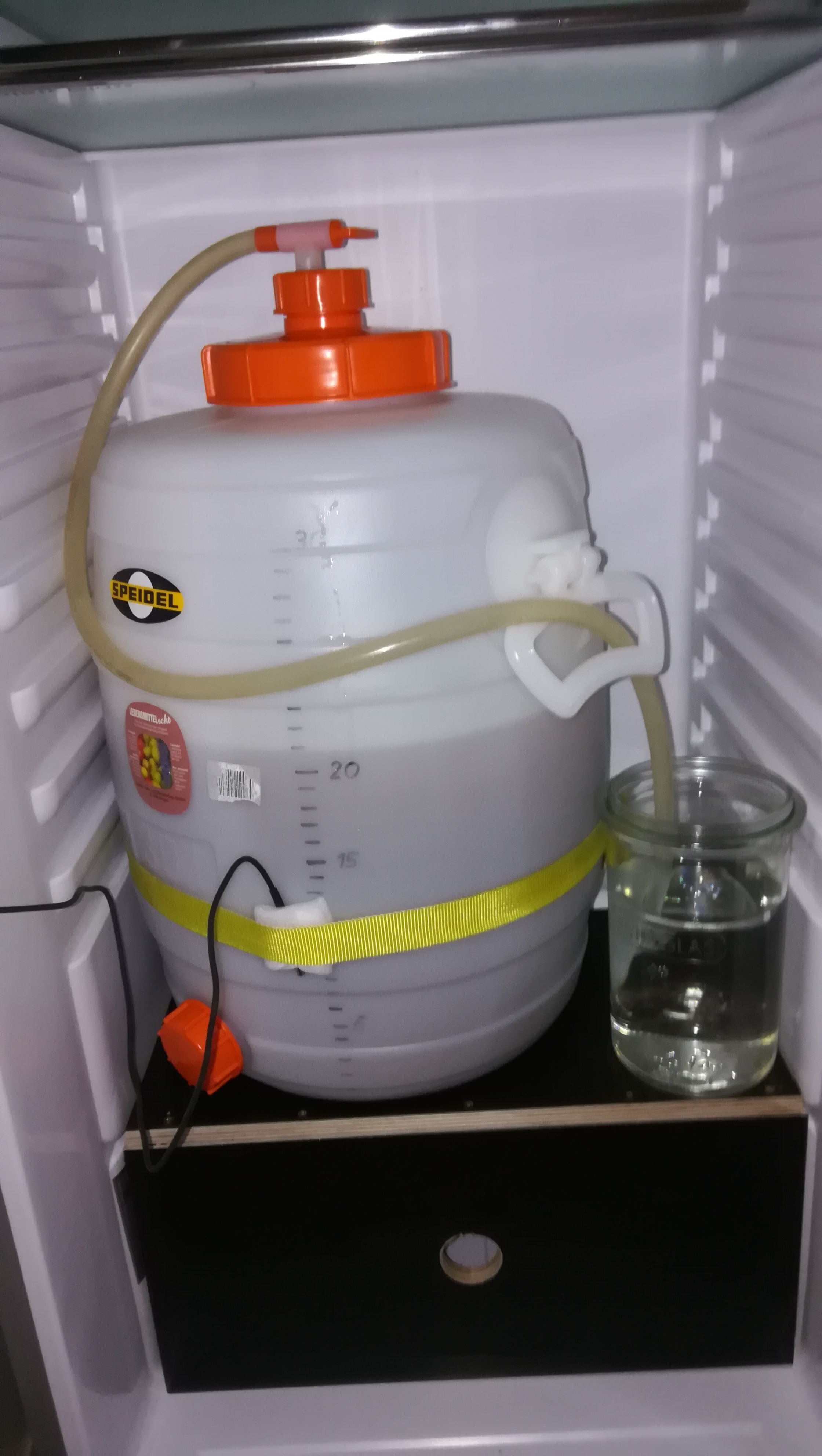 Anschließend kam die Würze in den Kühlschrank, der mit einem Inkbird gesteuert wird und auf 18 Grad eingestellt wurde.