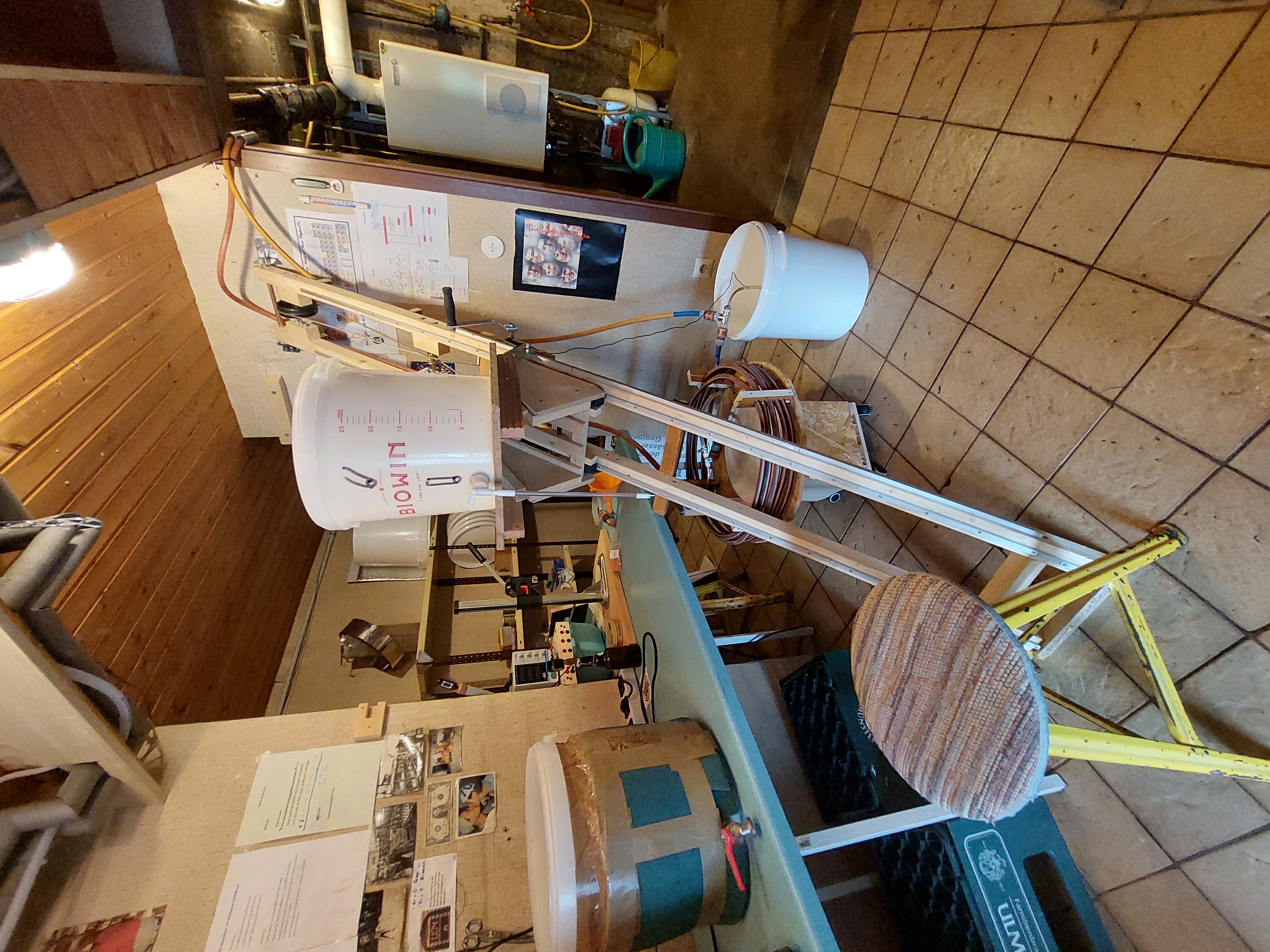 Habe mir vor einigen Jahren einen "Schrägaufzug" gebaut um den Gär- oder Jungbierbehälter zum Schlauchen bzw. Flaschenfüllen bequem in die richtige Höhe kurbeln zu können.