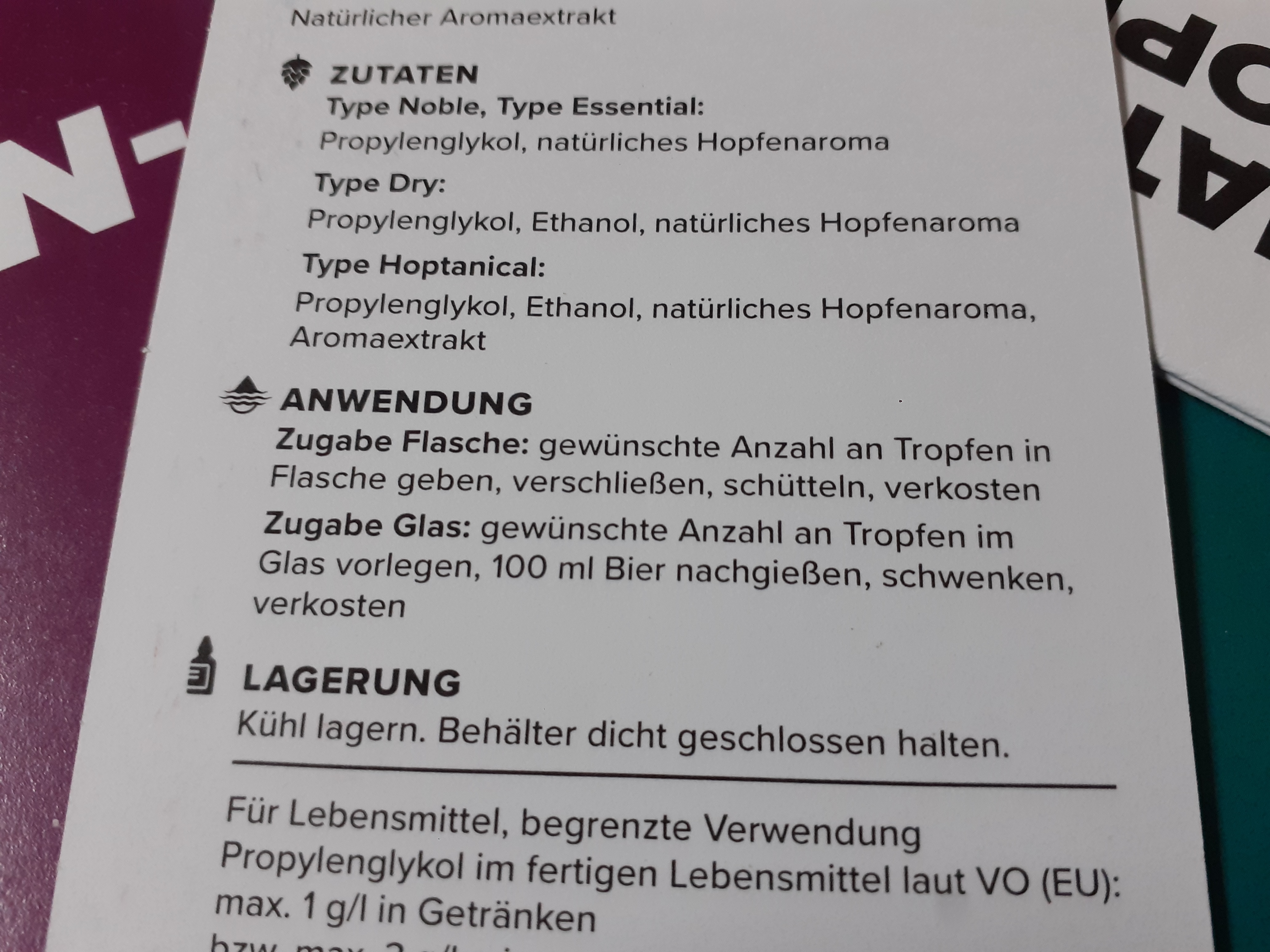 Unauffällig im Geruch. Bringt geschmacklich tatsächlich eine schöne würzig-kräuertige Note ins Bier. Gefällt mir tatsächlich ganz gut. Bei doppelter Dosage (2 Tropfen auf 100ml) kommt aber auch schon wieder die künstliche Geruchs- und Geschmacksnote durch.