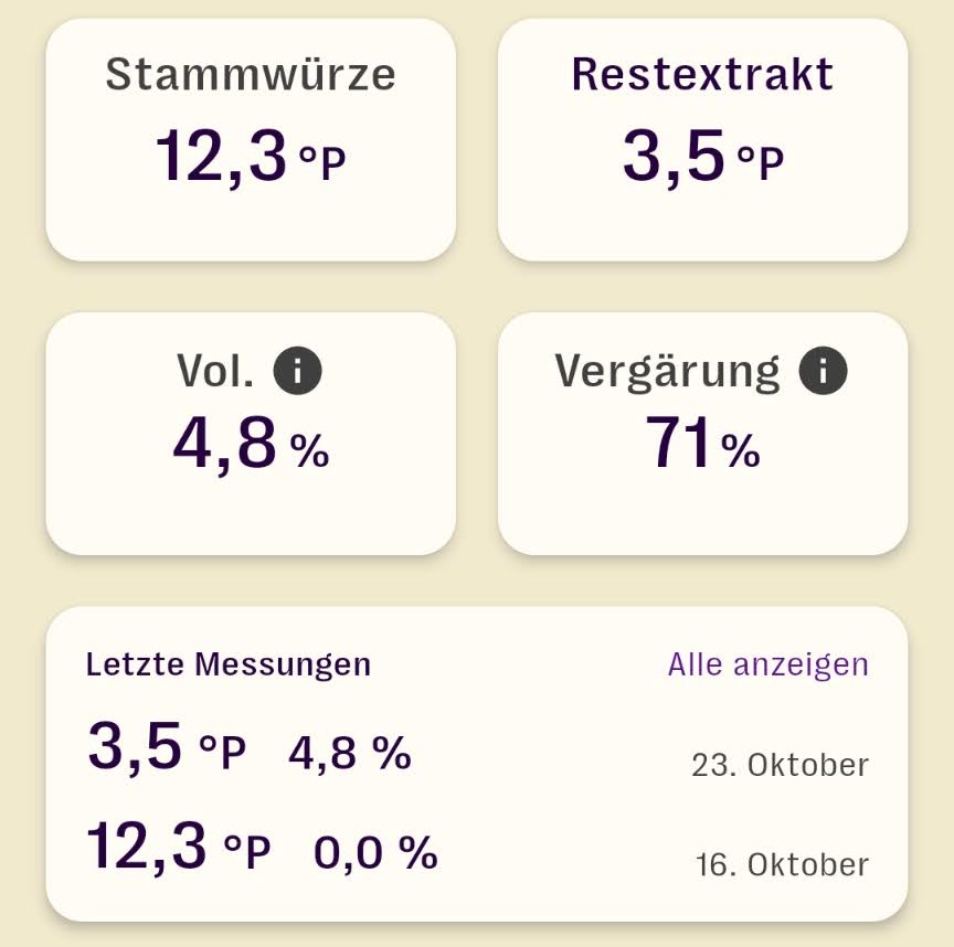 Der Restextrakt hat sich seit der Messung von vor 7 Tagen nicht mehr wirklich verändert. Ich bin bei 72% sVG gelandet.