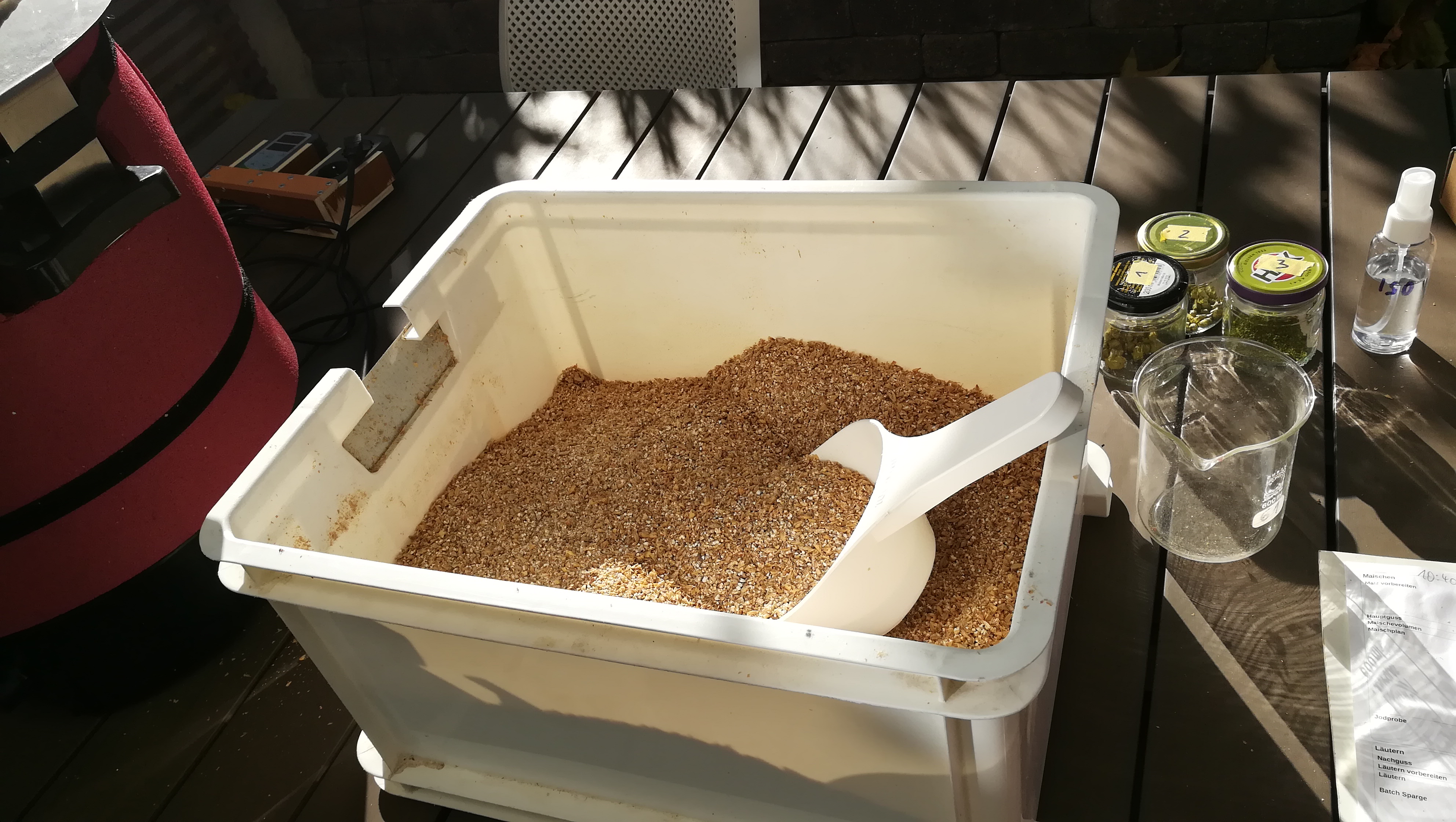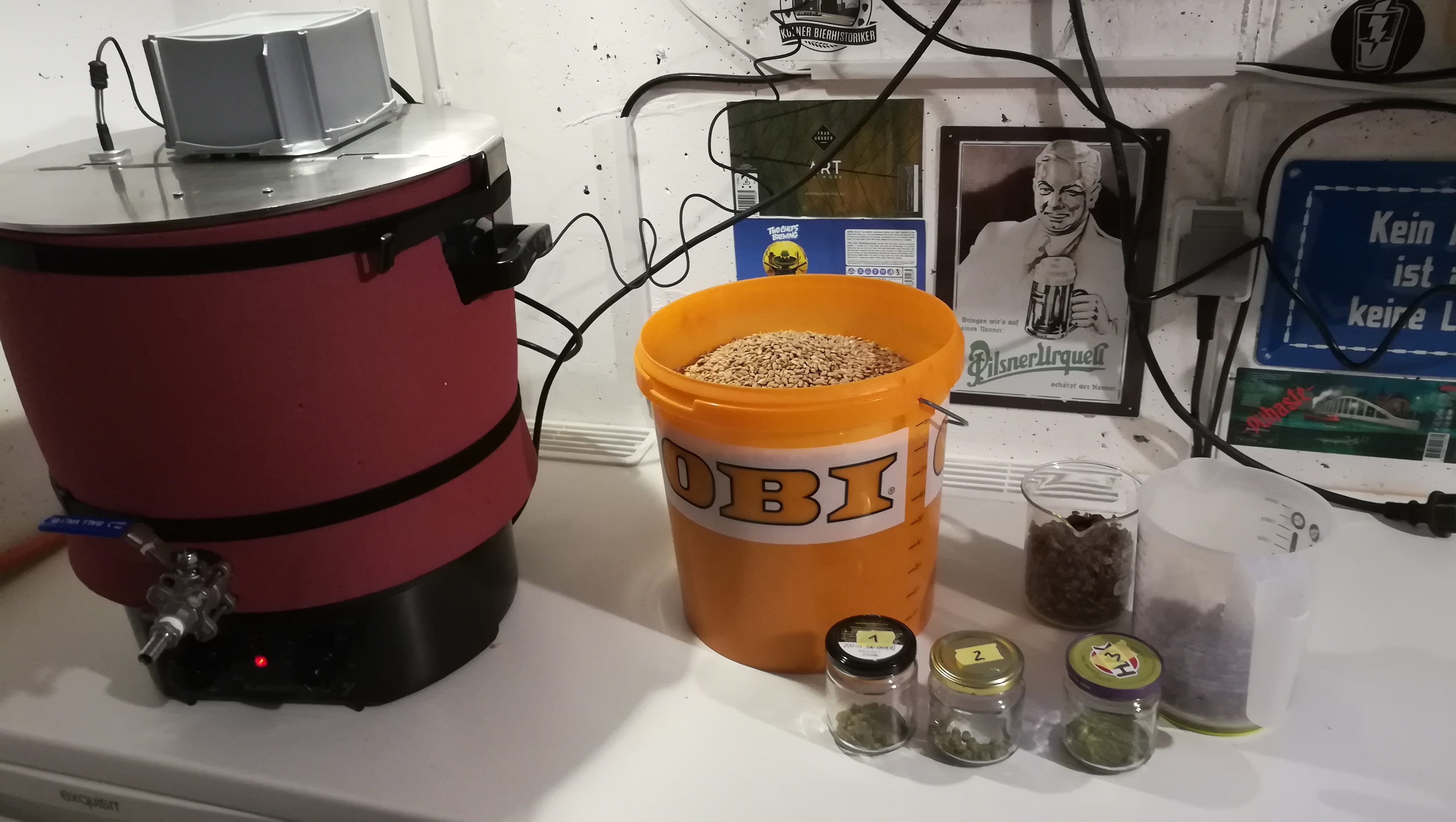 - Wir starten in der Brauecke im Keller. Schüttung steht zum Schroten bereit. Hopfengaben sind abgemessen, die Maronen stehen auch parat.