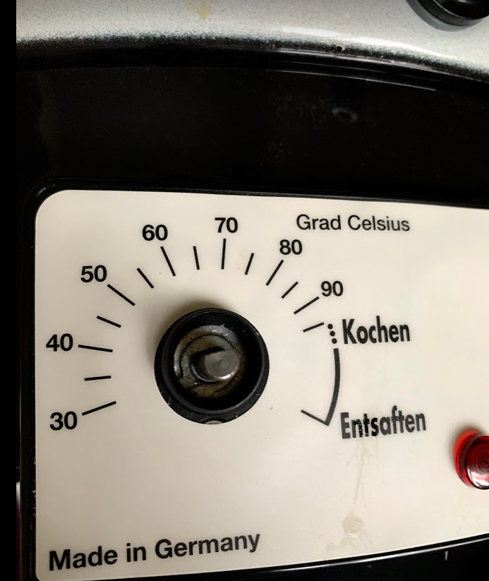 Mit der Schraube kannst du den temperaturgeführten Schalter drehen ohne dass sich der Knopf mitdreht und am "Entsaften" Maximum ansteht. Ich hab ungefähr soviel gedreht wie von der "Kochen" zu "Entsaften" Stufe ist.