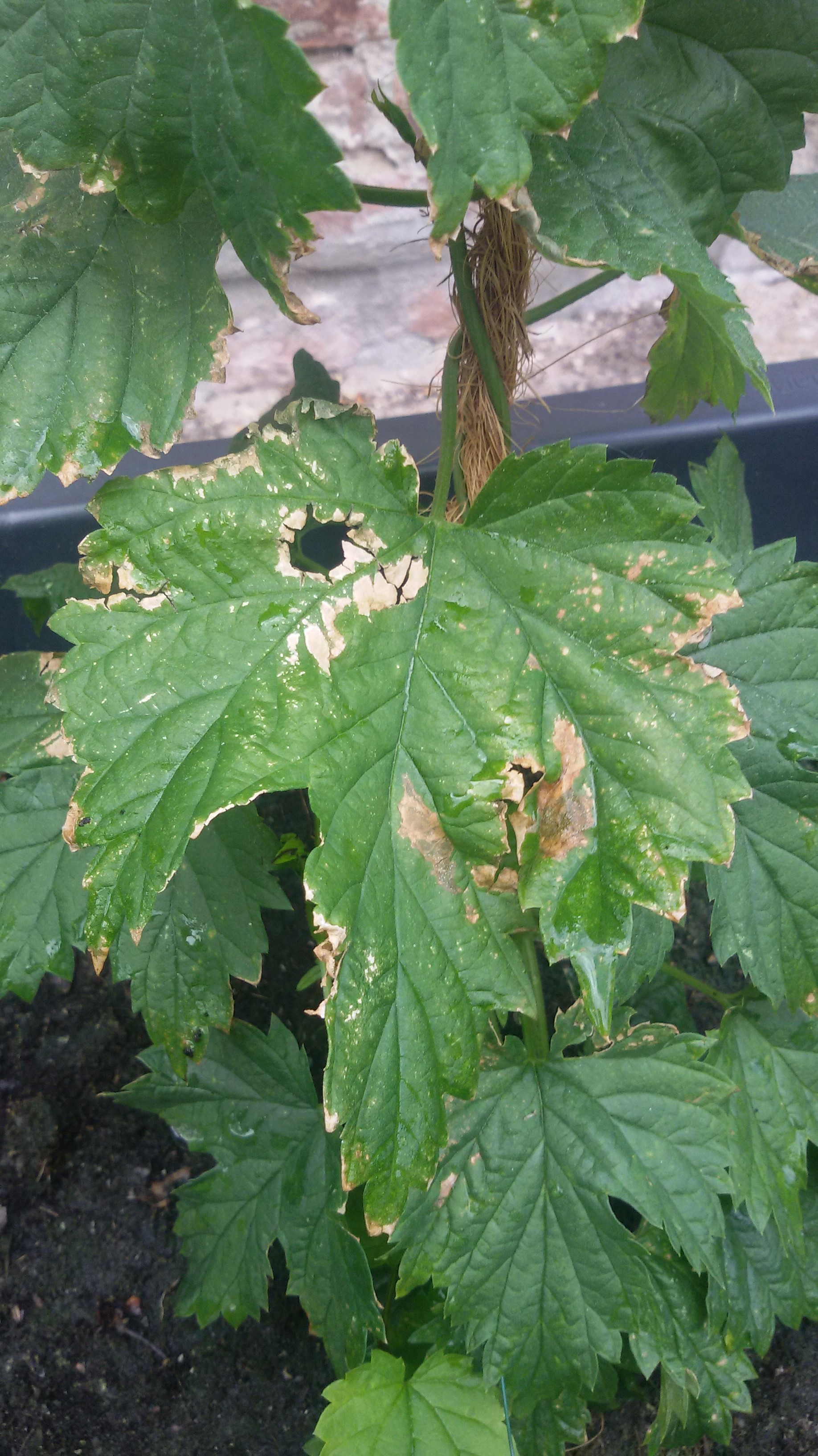 Das Schadbild sieht jetzt nicht unbedingt furchteinflößend aus. Bei Tomaten oder Chili wäre ich da vielleicht schon alarmiert, aber Hopfen ist so robust und wuchsfreudig, da würde ich mir wegen einiger kaputter Blätter keine Sorgen machen.