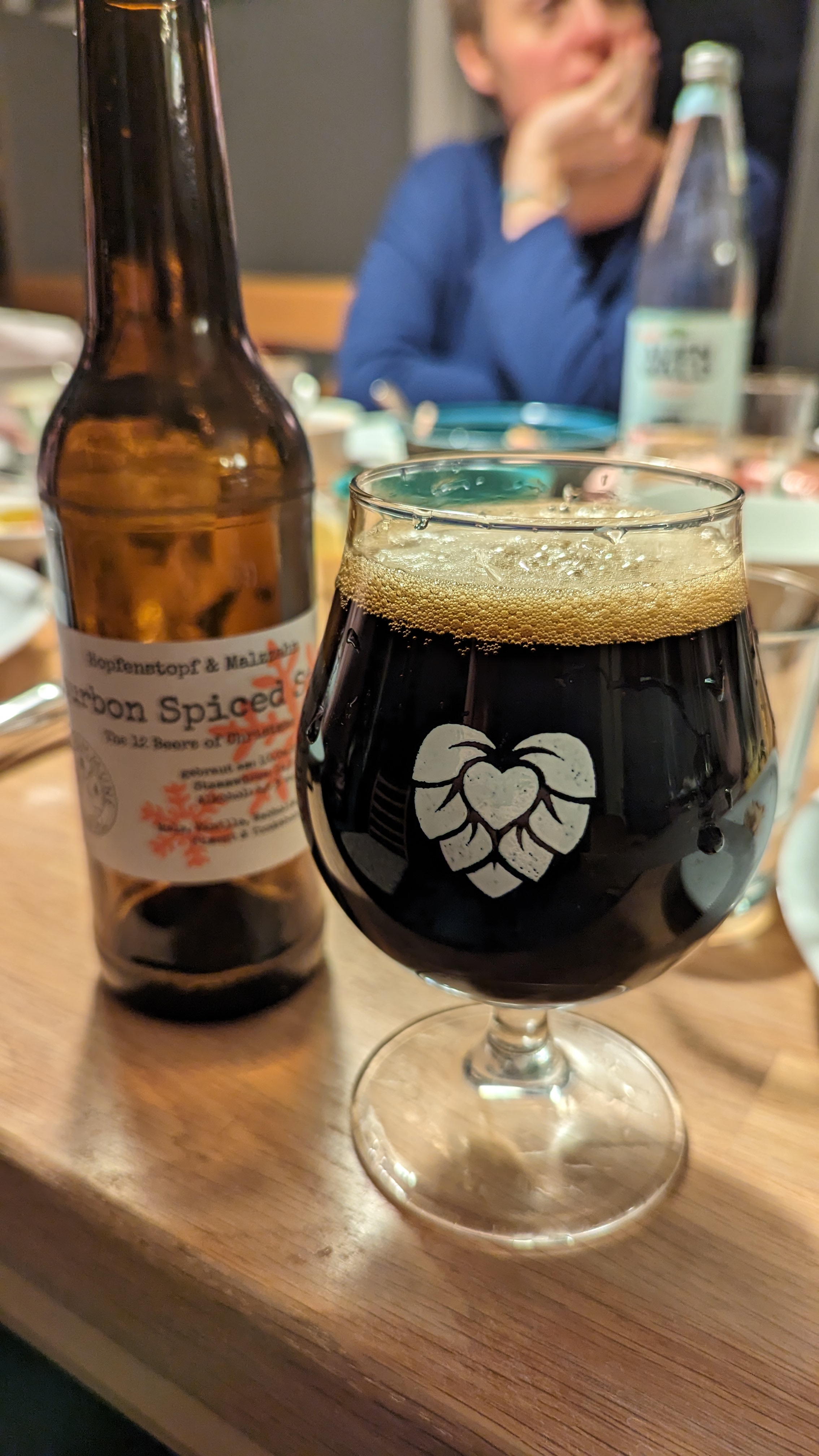 Danke, das freut mich (und Sylvie bestimmt auch)! Mit der Stammwürze war so eine Sache. Im Rezept steht OG 1050 (12 Plato). Das erschien uns schon etwas zu dünn. Deswegen sind wir auf 14,5 gegangen. Wir wollten nicht zu sehr abweichen. Bei den Gewürzen finde ich Wacholder (8 Beeren) ziemlich heftig, die Vanilleschote, die anderthalb Tonkabohnen und anderthalb Zimtstangen sind nicht so präsent wie erwartet. Das Bier ist mit den Monaten aber schon deutlich runder geworden.Geiles Ding.