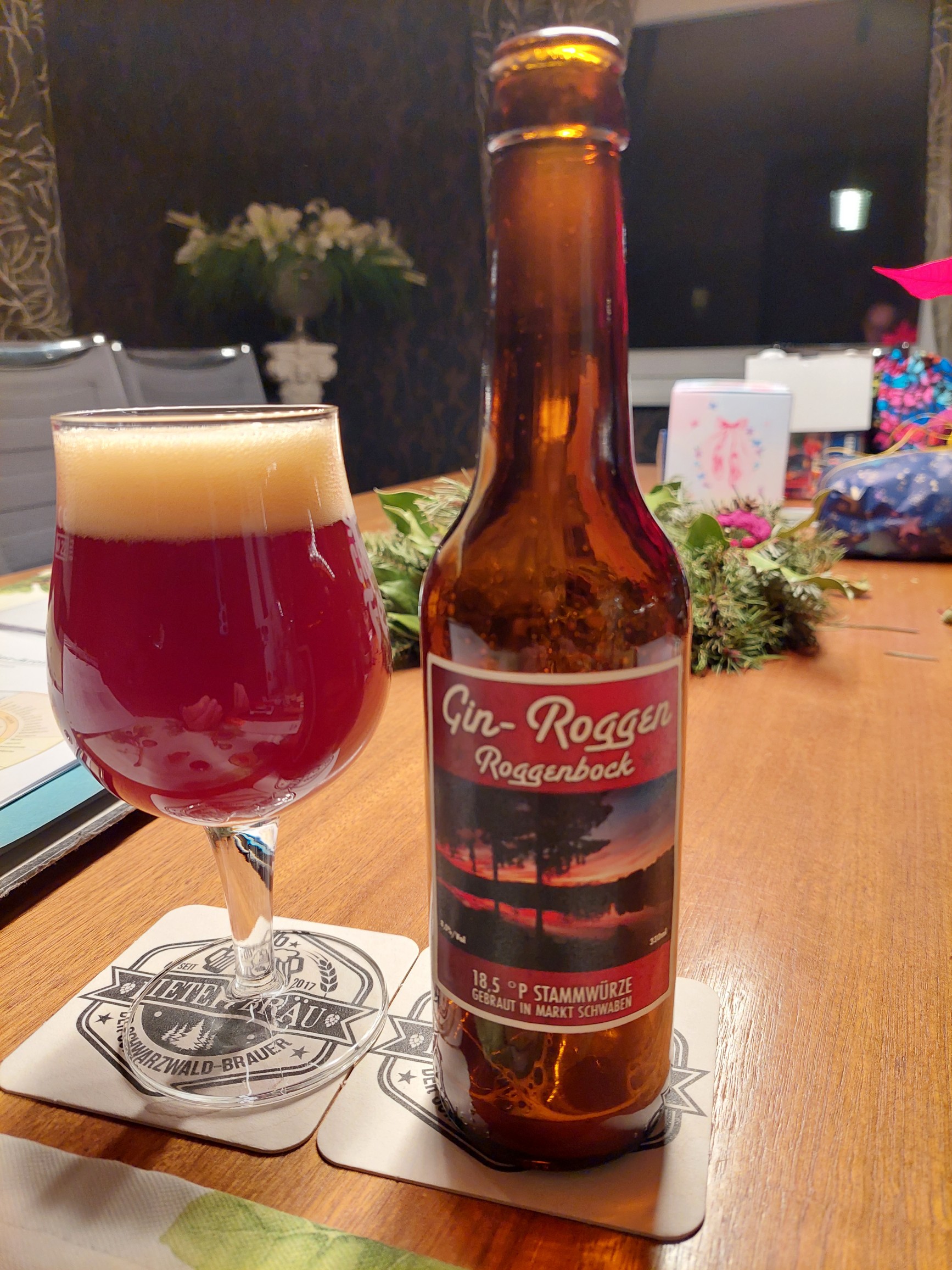 Volles Mundgefühl und leichte Säure, keine Dominanz der Röstaromen und bis auf die mMn zu deutliche Wacholdernote ein rundes Bier. Danke an Fabian, bin bereits auf das Quadrupel gespannt.