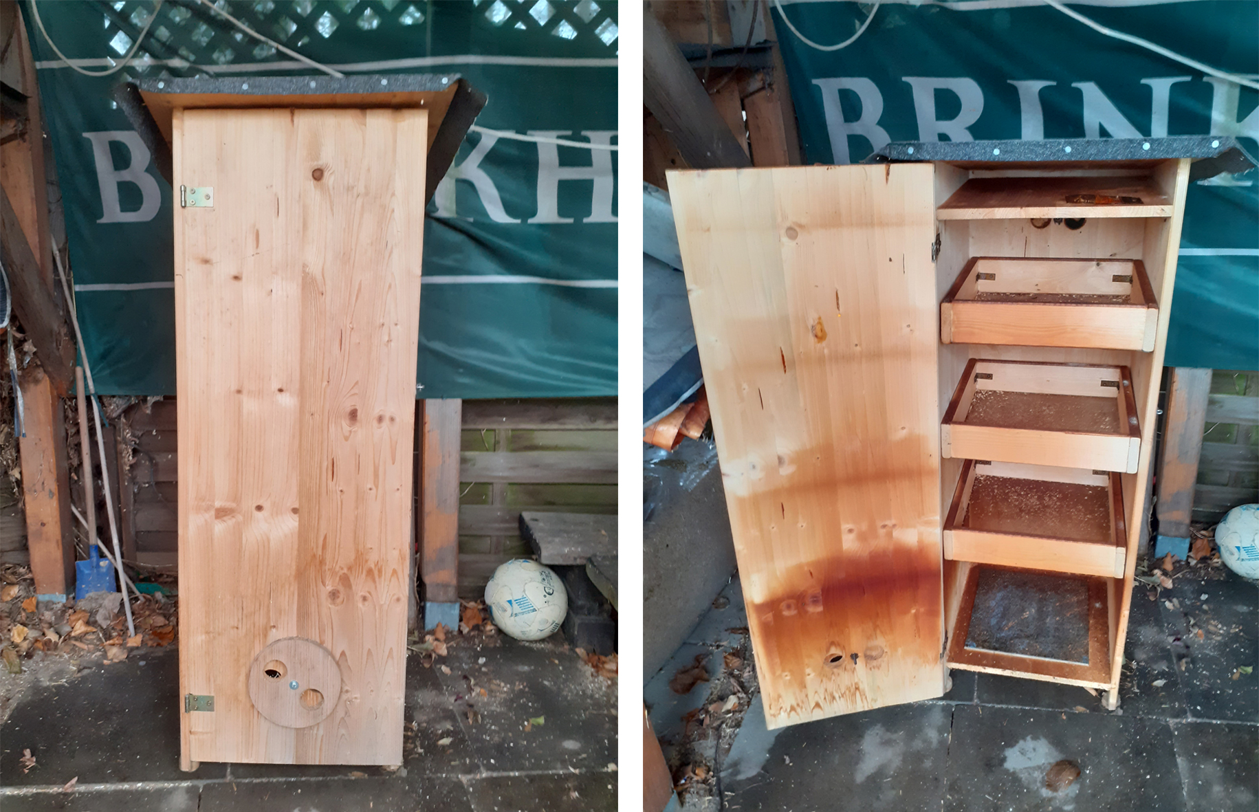 Den Schrank habe ich aus 18mm Leimhölzern, 40cm breit, aus dem Baumarkt zusammengedengelt. Die Schubladen aus einer Latte und Alu-Fliegengitter von der Rolle. Ich denke, die Bilder sind recht selbsterklärend. Wenn Interesse an den genauen Maßen besteht, kann ich die gerne noch nachreichen.