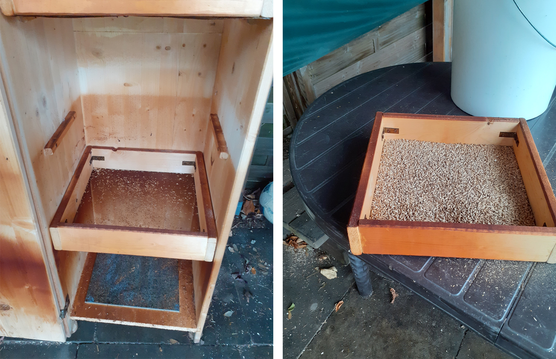 Drei Schubladen sind verbaut. Jede befülle ich mit 1-1,5 kg Malz. Die Reihenfolge der Schubladen vertausche ich einmal bei ca. der Hälfte des Räuchervorgangs.