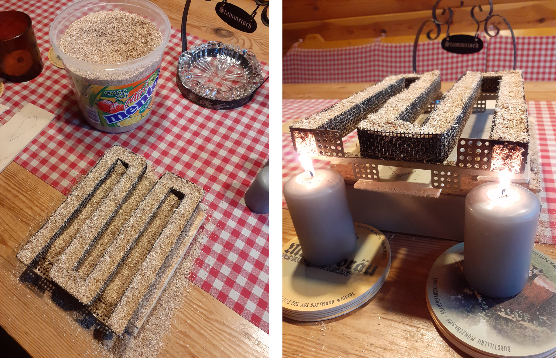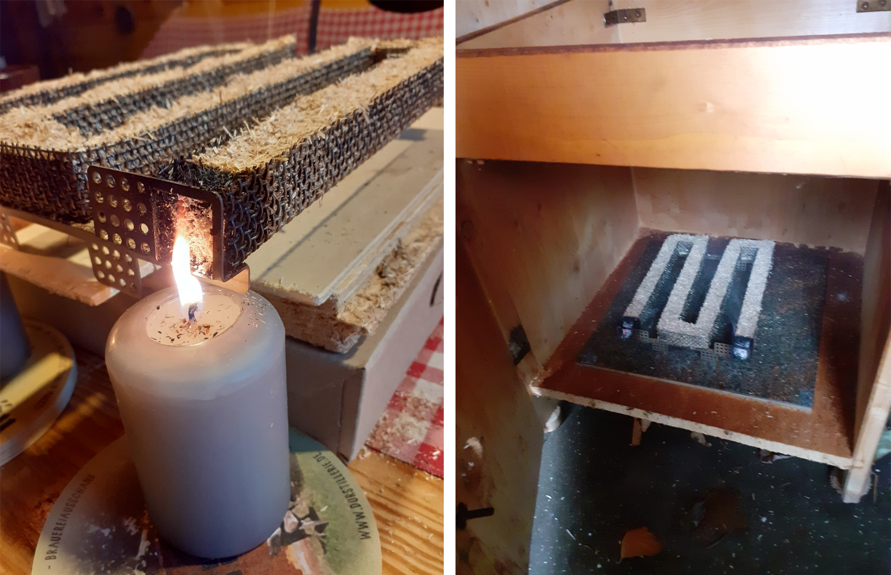 Der Sparbrand wird dann ordentlich mit Spänen befüllt, leicht angedrückt, und ein paar Minuten mit Kerzen oder Teelichtern an beiden Enden entzündet, bis es glüht und raucht. Dann ab damit in den Räucherschrank. Die Glühdauer beträgt ca. fünf Stunden.