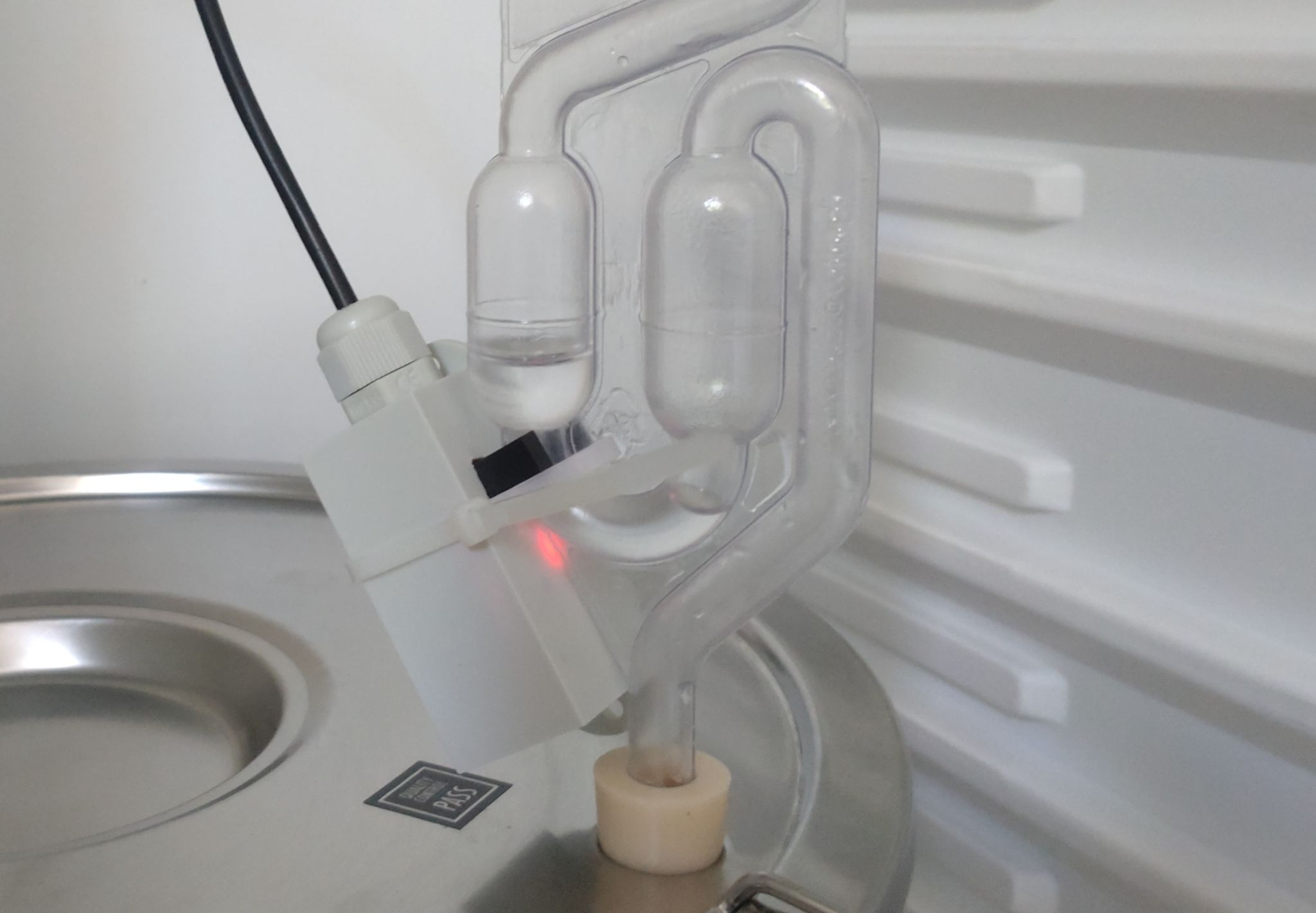 Die Gabel der Lichtschanke passt genau über das Röhrchen des Gärspundes, der Microcontroller ist in dem kleinen Gehäuse untergebracht.