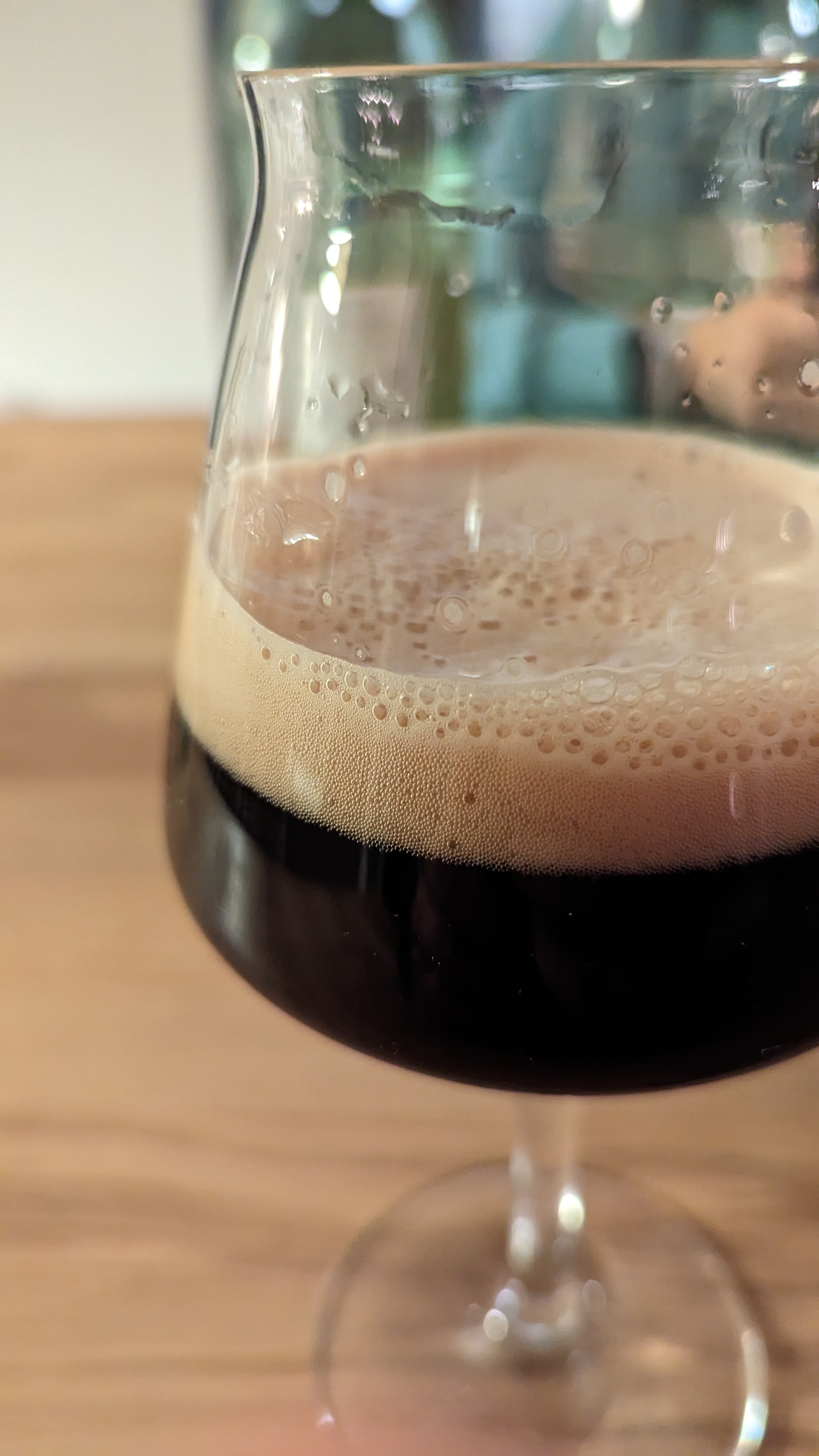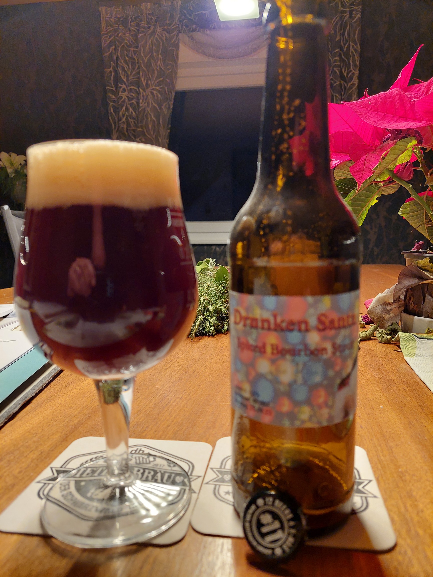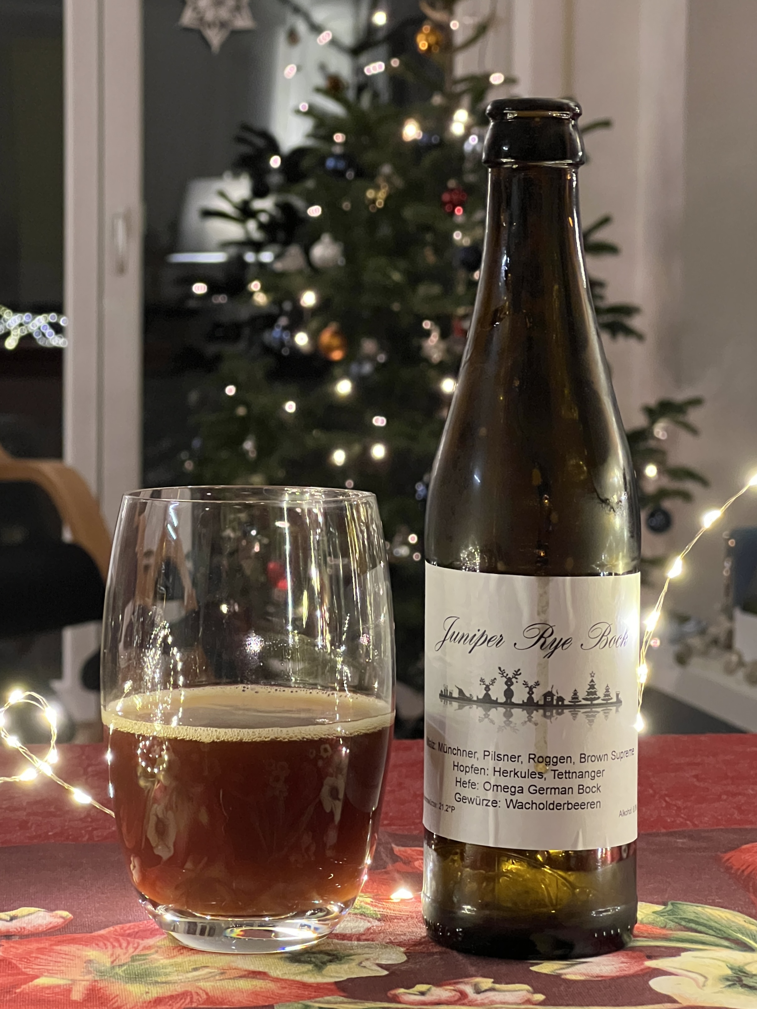 Heute ist der Juniper Rye Bock von Carsten (Kanton) dran. Wie schon im letzten Jahr ein super Bier. Und das sage ich, der eigentlich Bockbiere nur aus Neugier trinkt. Ordentliche Wacholdernoten, die nach ein paar Minuten noch stärker werden. Irgendwas anderes ist da auch noch in der Nase. Eine leichte Fruchtigkeit ist da noch. Orange? Dazu kräftige Noten von dunklem Malz. Die Karbonisierung ist moderat, was gut zum Bier passt. Super lecker, ich freue mich, dass ich noch zwei habe.