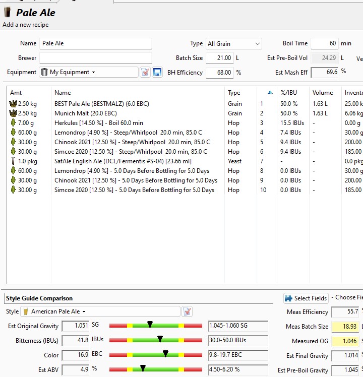Tja, schwierig. Die Hefe würde besser zum Ansatz von Shenenigans passen, aber die malzig-brotige Schüttung empfiehlt sich m.E. nicht für ein Pale Ale. Vielleicht was in der Mitte. Das verlinkte No. 11 mit je 1 g/l Simcoe und Chinook im Whirlpool. Arbeitstitel: Klosterbier auf Speed.