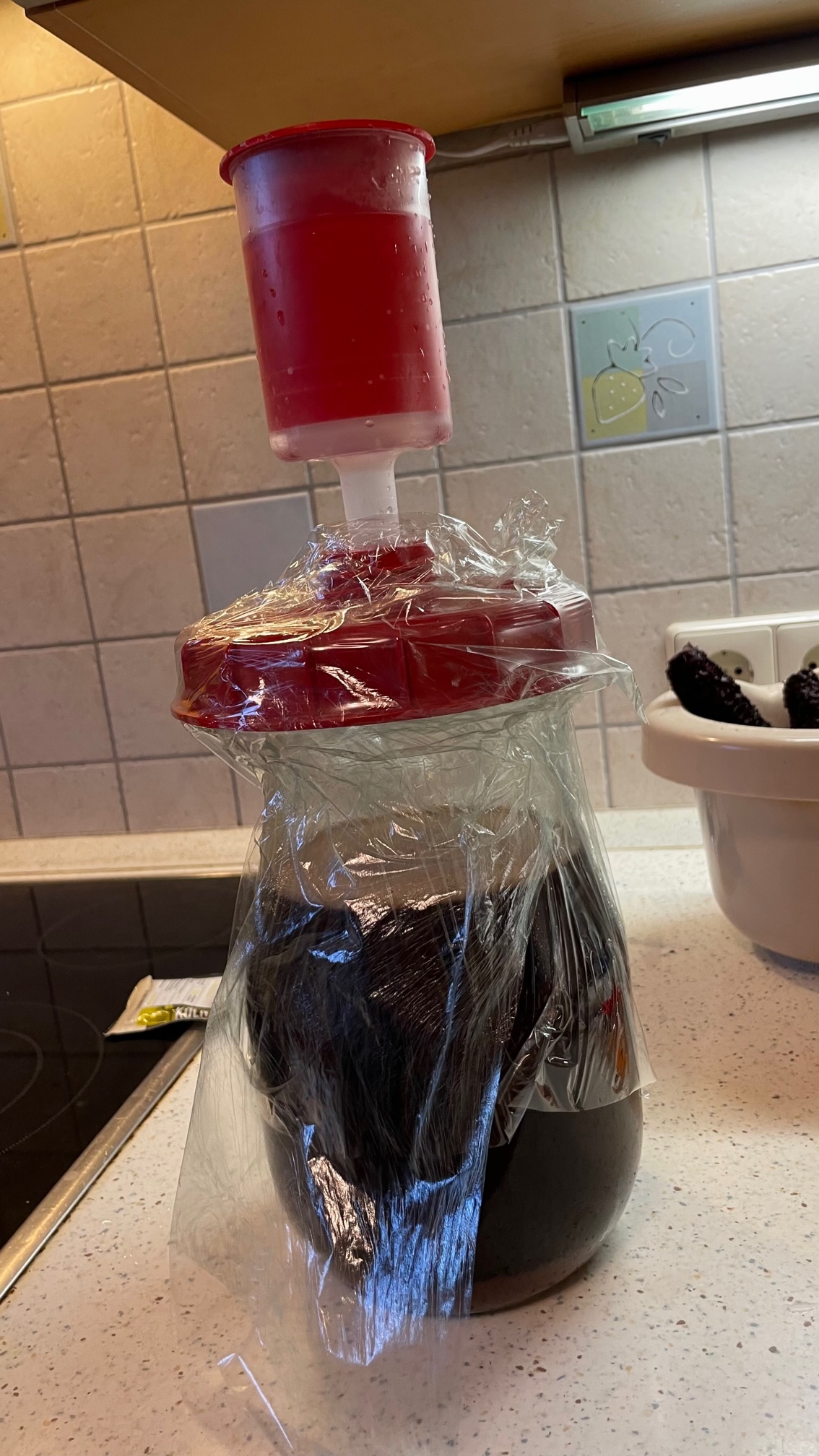 Im Kühlschrank ist mir dann auch noch eine K97 kurz vor MHD in die Hände gefallen, damit war klar was mit den 2 Litern Würze passiert, die nicht mehr ins Fass passten (Frischhaltefolie forever!)