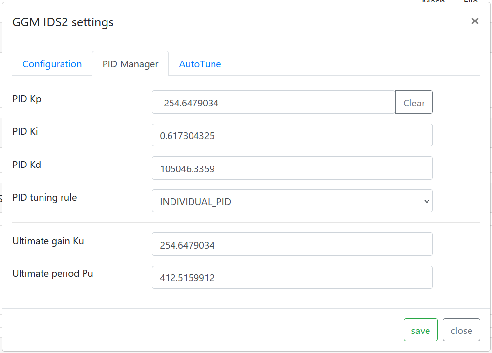 Die IDS2AutoTune ist nur eine Info. Wenn Du die Zeit hast, mach ein AutoTune mit Debug. Wenn nicht: trage Ku und Pu ein -> abspeichern. Wähle Brewing_50l. Dann sollte Dein PID Controller arbeiten.