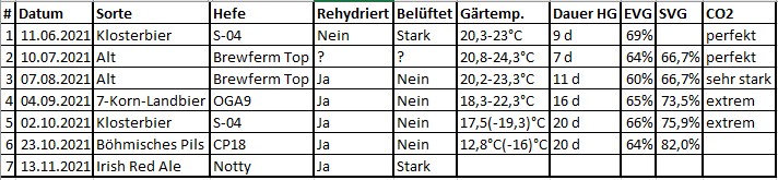 Sura hat geschrieben: Freitag 25. Februar 2022, 17:55 Beim Klosterbier war es auch eventuell zu wenig Hefe. Da fehlen die Liter die ausgeschlagen wurden, aber so knapp 25-30 könnten das gewesen sein, oder? Allerdings sind da auch 25% Cara und 50% MüMa drin, da sind 70% jetzt nicht unbedingt unnormal. Und die Dauer ist auch noch im Rahmen.