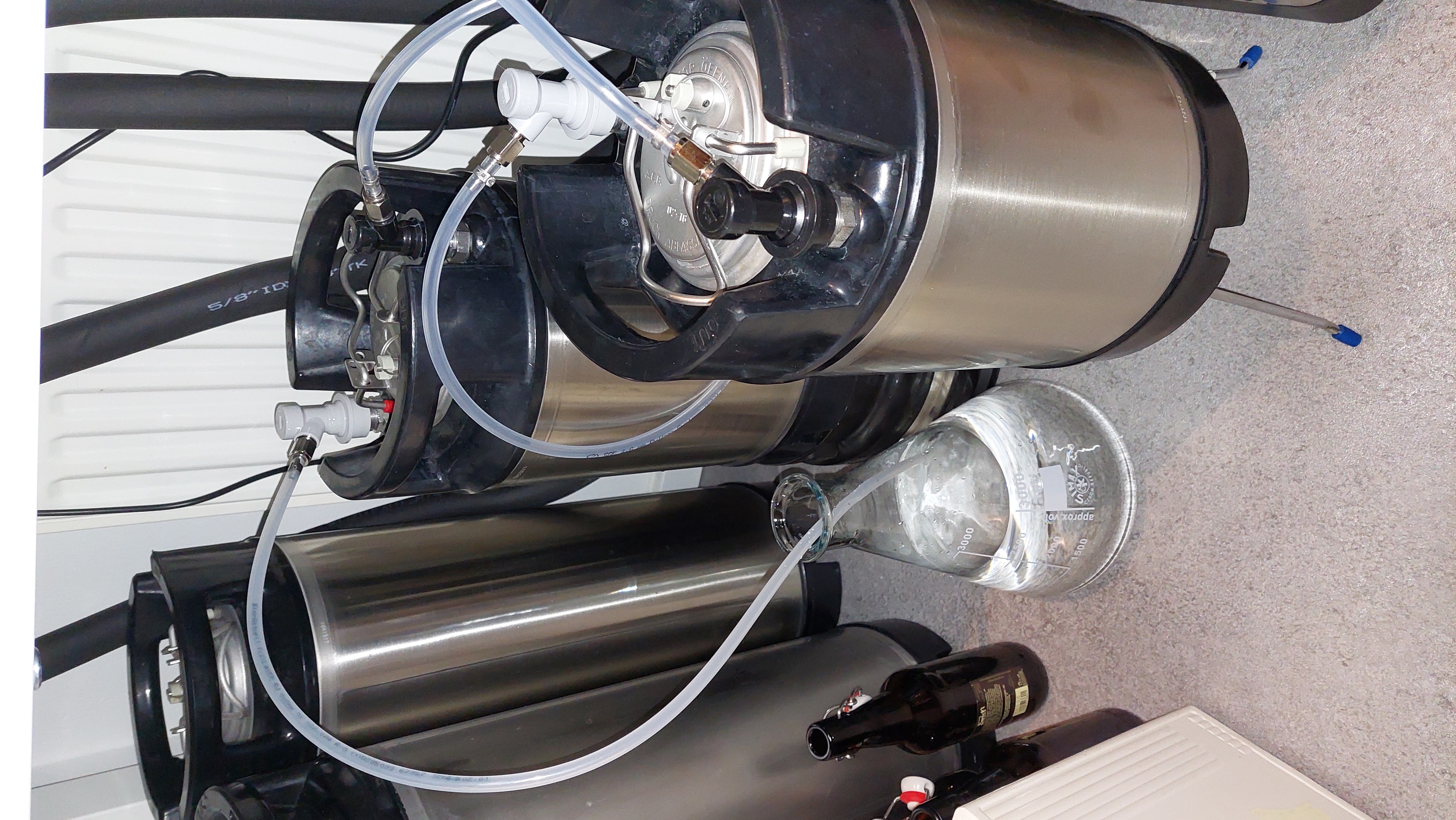 Das Setup ist ziemlich dicht (bei Überdruck zischt es dann irgendwann am Deckel raus) und die Kohlensäure der Gärung durchströmt die später genutzen Kegs. Vom Co²-Ausgang des Fermenters geht es mit einer CO²-Leitung zum Getränkeausgang des ersten Kegs. Von hier strömt das CO² dann unten ein. Dann eine Verbindung vom Gaseingang des Kegs, direkt zum zweiten Keg (Getränkeseite) und von dessen Gaseingang in einen Erlenmeyerkolben mit Wasser. Somit sind die Fässer in Reihe geschaltet. Man kann aber auch pro Fermenter 1 Keg "Solo" spülen. Die Fässer fülle ich vorher NICHT mit Wasser. Während der Gärung entsteht soviel Kohlensäure, dass die Fässer verlässlich gespült werden. Habe dazu erst kürzlich einen Artikel gelesen.