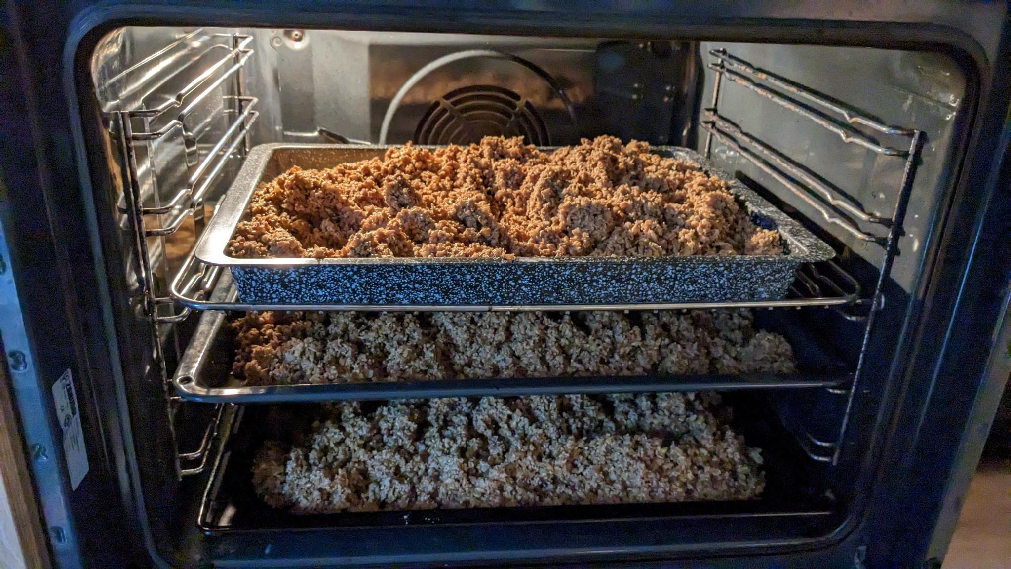1. Trocknen des Trebers bei 100 °C im offenen Backofen für eine Stunde: 2. Abfüllen des Trebers in Vakuumbeutel und Vakuumieren (Inhalt ca. 2 kg), wichtig der Beutelwird im Anschluss gekocht und bläht sich dabei auf, deswegen genug Platz nach oben lassen. 3. Abgepackten Treber für 2 Stunden in kochendes Wasser werfen (wir verwenden dazu unseren Nachgusskocher, ein billiger Metro Einkocher)