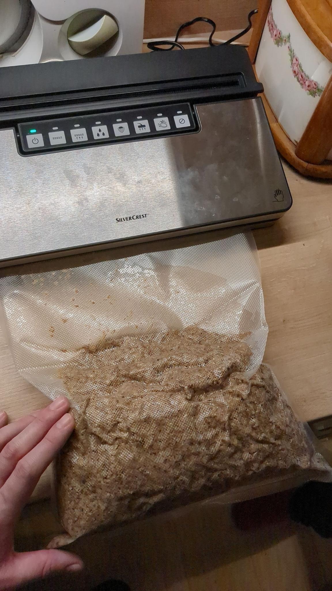 2. Abfüllen des Trebers in Vakuumbeutel und Vakuumieren (Inhalt ca. 2 kg), wichtig der Beutelwird im Anschluss gekocht und bläht sich dabei auf, deswegen genug Platz nach oben lassen.