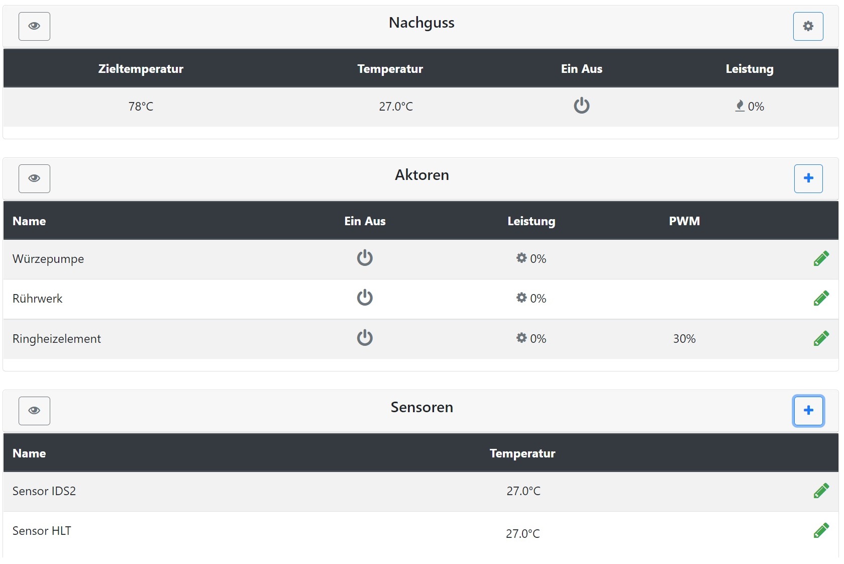Informationen zur Hardware habe ich bewusst noch nicht in die Beschreibung & Anleitung aufgenommen. Aktuell setzen einige Forenuser mit einem MQTTDevice den Brautomat ein. Diese User verfügen bereits über die benötigte Hardware und mussten nichts extra kaufen. Über PN habe ich eine ganze Menge Feedback bekommen. Der Test in verschiedenen Brauküchen war bzw. ist sehr hilfreich.