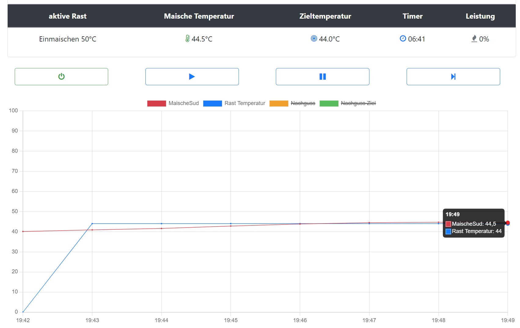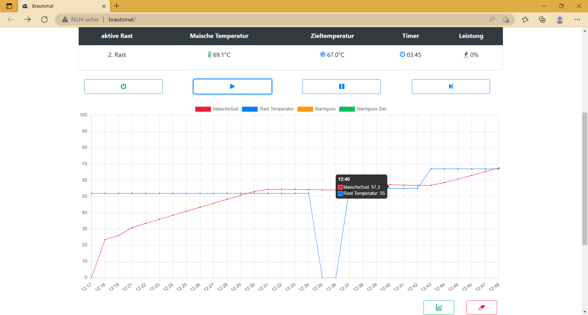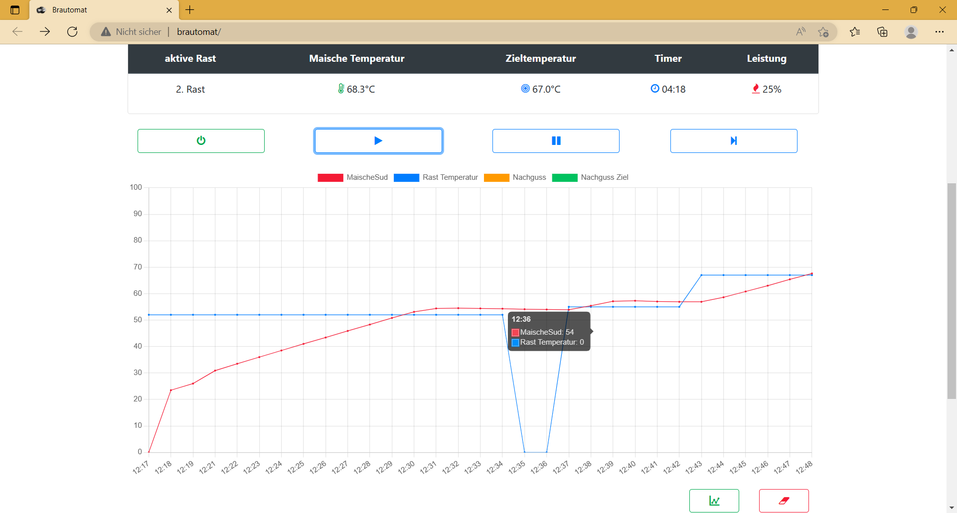 Der Brautomat behält aber bis nach Überschreiten der der Rasttemperaturen diese 50% voll bei. Eine Annähreung an die Rasttemperatur erfolgte nicht.