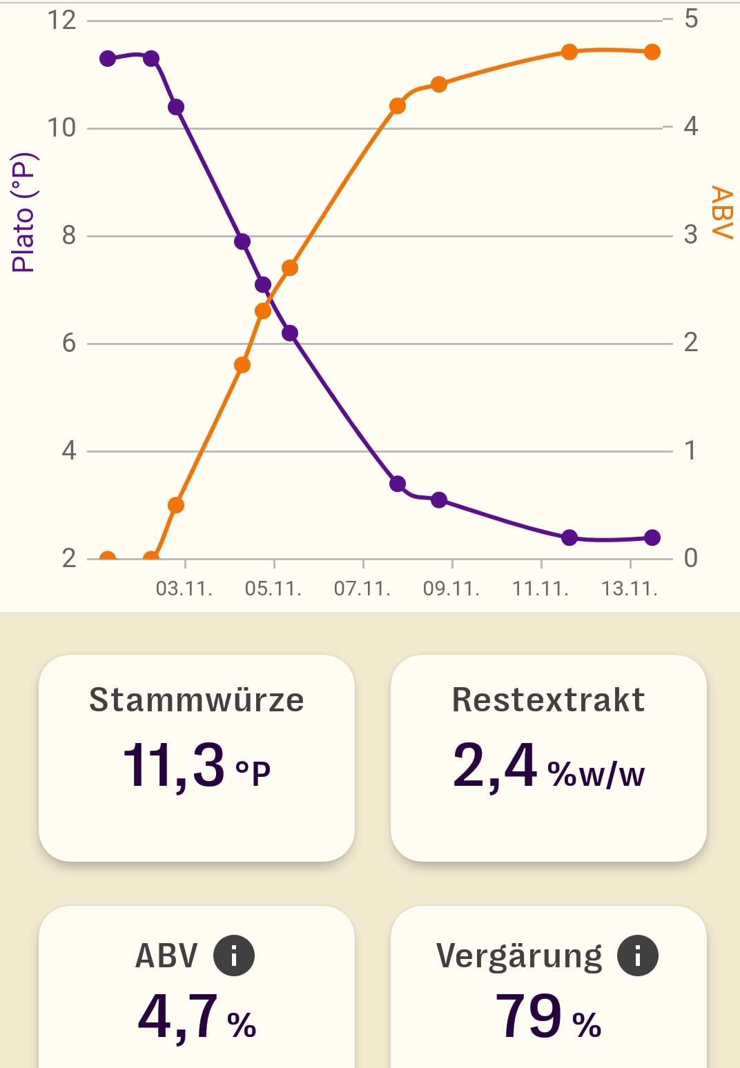 Edit: zu meinem Verlauf oben. 9°C Anstell- und Gärtemperatur, Gozdawa W34/70 Trockenhefe, Menge nach oberer Grenze Herstellerangabe, rehydriert, ab 50% unter Druck.