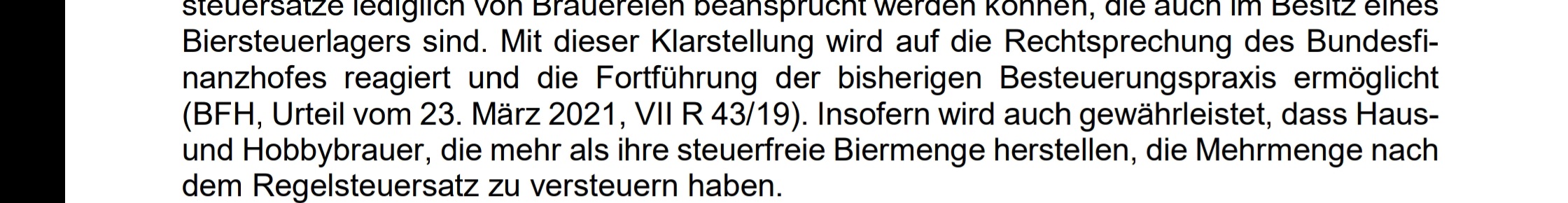 Und was soll das bringen? Das Biersteuergesetz ist ja die Rechtsgrundlage. Der Gesetzgeber hat mit Zustimmung der Länder nun eine Legaldefinition eingeführt, die es vorher nicht gab. Das war ja der Grund, weswegen der ermäßigte Tarif auch den Hobbybrauern zugestanden wurde, da die Definition willkürlich vom Ministerium per Verordnung erlassen wurde.
