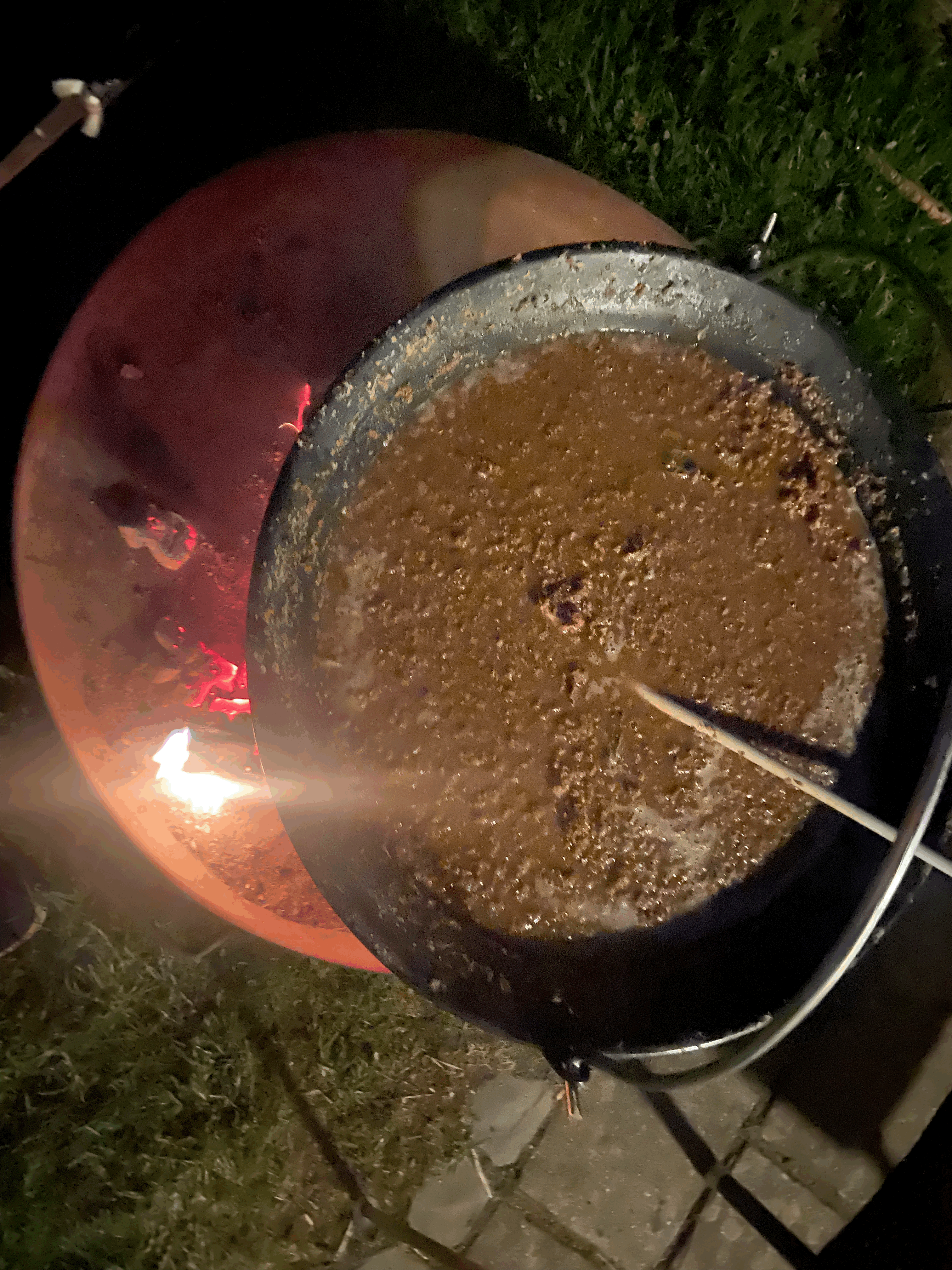 Die eigentliche Herausforderung war das Maischen mit der Kessel überm offenen Feuer. Um trotz der voluminösen Schüttung in den Kessel zu passen, musste die Maische sehr dick angesetzt werden (ca. 14l Wasser). Nach dem Einmaischen mit warmem Leitungswasser hatte die Maische eine Temperatur knapp unter 40 Grad (das habe ich gemessen, um ein Gefühl dafür zu bekommen). Die Hälfte der Triebe habe ich einfach mit in Maische geworfen.