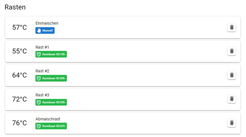 In der Zwischenzeit steht der Rest im 36L Topf auf der Hendi wird durch den Brick entspannt bei 64°C gehalten (Rührwerk habe ich auch noch drinnen). Wenn ich dann mit dem Kochen durch bin, brühe ich die Dickmaische zu und geh in Deiner Weboberfläche manuell zum nächsten Schritt über (was man ja easy und Problemlos machen kann). Wenn alles geklappt hat, bin ich direkt auf 72°C mit der gesamten Maische, wenn nicht, steuert der Brick weiter. Ich erhöhe dann nach 20min bei 72°C noch einmal kurz auf 76°C, und fertig!