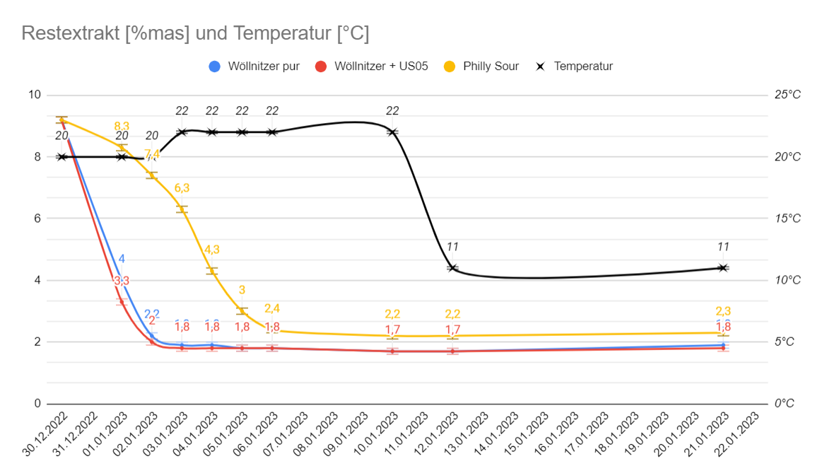 Ich habe bei den Messungen auch regelmäßig den Geruch und den Geschmack der Proben getestet. Der sehr ähnliche Gärverlauf und der nahezu identische sehr typische Geruch lässt darauf schließen, dass im Teilsud 2 ebenso vor allem die Wöllnitzer Mischkultur die Oberhand gewonnen hat und die US05 Hefe am Ende gar keinen allzugroßen Anteil hatte. Aber sie war ja sowieso nur eher als Backup gedacht, falls die Gärung von Teilsud 1 nicht richtig durchgestartet wäre.